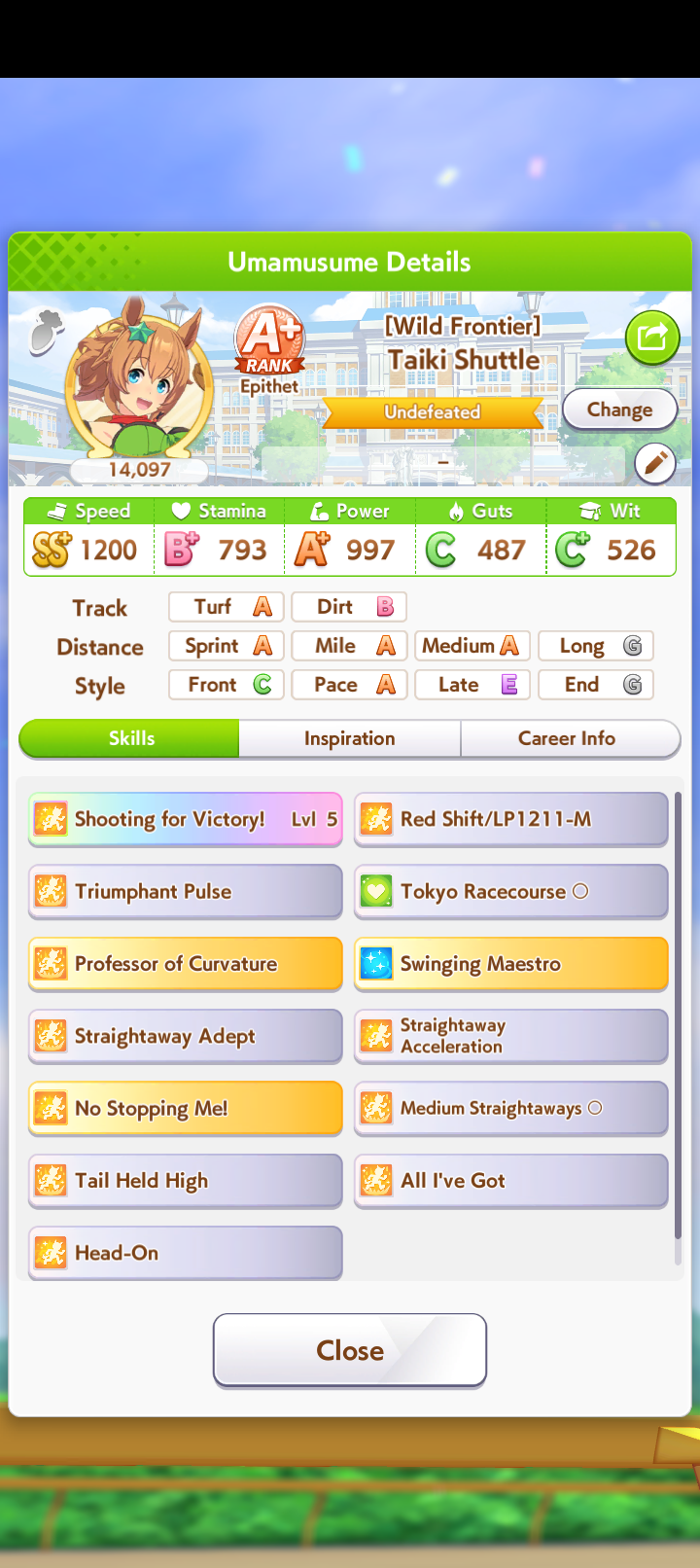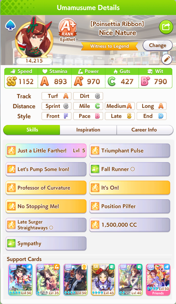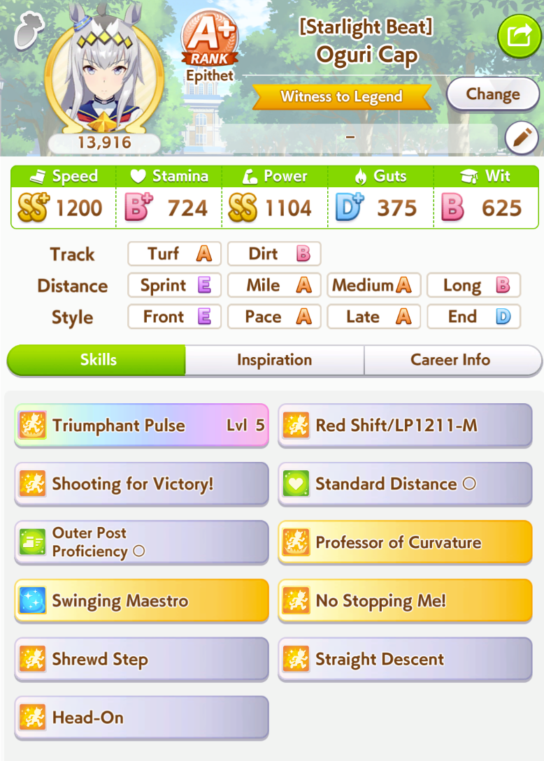 >>550681093Yes. If you want to be a pace chaser main, you need her. Together with Taiki, and Oguri, these 3 are your main unique skills to inherit, sometimes you can grab specialized uniques like Summer Tachyon.Nishino Flower and El Condor Pasa speed card for the gold acceleration for pace are your must pulls if you plan to pace chase in the future