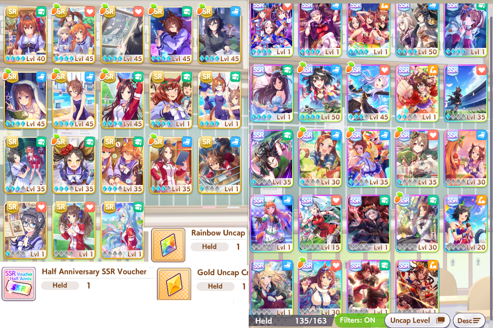 >>550670762Pulling 400 cards really fills the SR holes. I don't even HAVE anything to use my gold uncap crystal on, guess I'll save it for Light Hello or something. Everything's MLB except Mejiro Ardan and Tosen Jordan. >inb4 explodeMy SSR situation is still the normal f2poor:>mlb kita>3lb creek>3lb biko>1lb finemo>mlb pasaok well the mlb pasa was very lucky, but I'd rather I got those pasas as kitas instead and only dropped 30k instead of 60k, now at 400 carats.