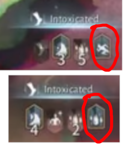 >>550720819>Why the FUCK isn't there a bigger sign for when you're drunk?There IS a buff indicator but it seems to be bugged and copies a random other buff icon instead of having a consistent appearance. So it's hard as fuck to keep track of.You can see here it suddenly changed from running-man icon to a copy of the strat bleed icon in the middle of your combo.