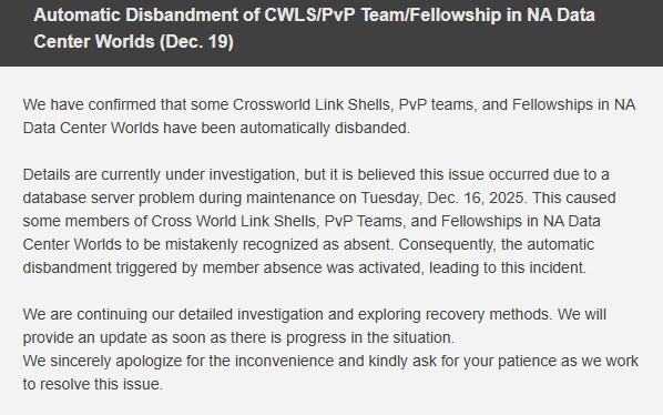 12/19/2025 2:00 AMAutomatic Disbandment of CWLS/PvP Team/Fellowship in NA Data Center Worlds (Dec. 19)We have confirmed that some Crossworld Link Shells, PvP teams, and Fellowships in NA Data Center Worlds have been automatically disbanded.Details are currently under investigation, but it is believed this issue occurred due to a database server problem during maintenance on Tuesday, Dec. 16, 2025. This caused some members of Cross World Link Shells, PvP Teams, and Fellowships in NA Data Center Worlds to be mistakenly recognized as absent. Consequently, the automatic disbandment triggered by member absence was activated, leading to this incident.We are continuing our detailed investigation and exploring recovery methods. We will provide an update as soon as there is progress in the situation.We sincerely apologize for the inconvenience and kindly ask for your patience as we work to resolve this issue.