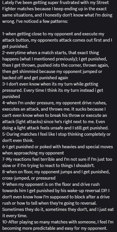 The root of the problem is I'm fucking retarded and i can't do shit. Every action i take is the wrong one. People just runs at me and I instantly lose. I try to press a button to prevent them but whatever they presses wins every time and I just don't understand. Someone constantly jumps into the air and I don't know what to do about it. Every single time I mention this all I get is "same". Really fucking helpful. I lose every fucking air exchange. I don't know what I'm doing wrong. I don't know what's going on and causing me to be this bad, but every fucking time I try to ask about this the only fucking thing people say is "same".