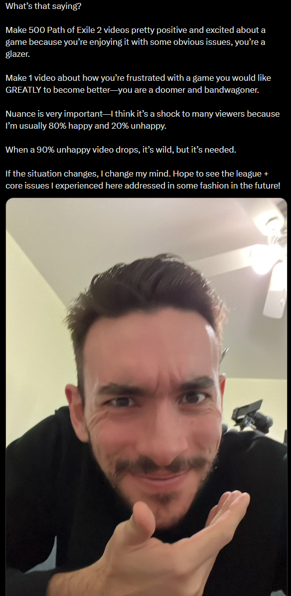 >>550737435>but the gameplay feel of poe1 is also a major paon point for many people, what happened there? "poe1 has no gameplay" gets parroted over and over.this is mostly said as a cope by tourists who have massive fox and grapes syndrome and who were never intellectually competent enough to reach those levels of play. They hate what they don't know, and therefore hate poe1 out of spite. No one who is able to pilot a build up to the point dislikes it, or they wouldn't have grinded out the necessary hours to get there, i.e that power doesn't come cheap or easy
