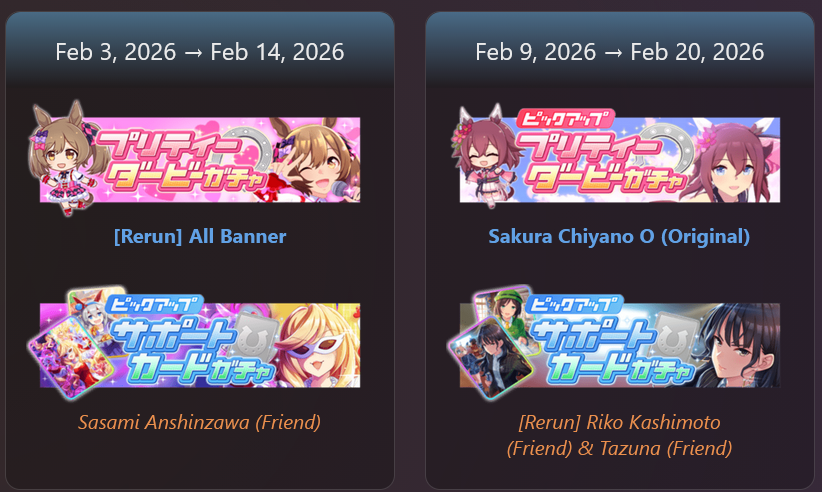 Previous: >>550742181>Global Game NewsLink your account to Cygames iDCurrent Scenario: Aoharu Hai aka "Unity Cup"Current Event: Orchestra in Late AutumnCurrent Rate Up Trainee: Symboli Rudolf 3* [Alt], Gold City 3* [Alt], Tosen Jordan 3*Current Rate Up Support Cards: Curren Chan SSR, Narita Brian SSR, Kitasan Black SSR, El Condor Pasa SSR12/18 - Kitasan Rerun12/24 - Fuji Event12/28 - Scorpio Cup - Tokyo Turf 2000mhttps://umamusume.com/news/100040/https://pages.snep.pw/uma/anni-skill-changes/>JP Game NewsCurrent Rate Up: Oguri Cap 3* [Cinderella Grey] Inari One (SSR)New Scenario "Yukoma Hot Spring" releasedTimeline: https://uma.moe/timelineCygames Webstore: https://webstore.cygames.com/en/umamusume_en/>IP NewsUmamusume Cinderella Gray 2nd season started weekly airings on 10/5>Thread Clubshttps://rentry.co/umaglobalclublistYou must be E3 (20k points) to join a circle. Apply with /uma/ or /vg/ in your profile or post ID in the thread.>All Guides & Resourceshttps://rentry.org/uma26Game databasehttps://gametora.com/umamusume (Click the gear to switch between JP / global server info)A basic guide for newfagshttps://rentry.org/umaglobalFind networks if your region is blocked from the game or clienthttps://www.umavpn.top/93Seiyuu & Concertshttps://rentry.org/umstUma storieshttps://umareader.idsmile.xyz/