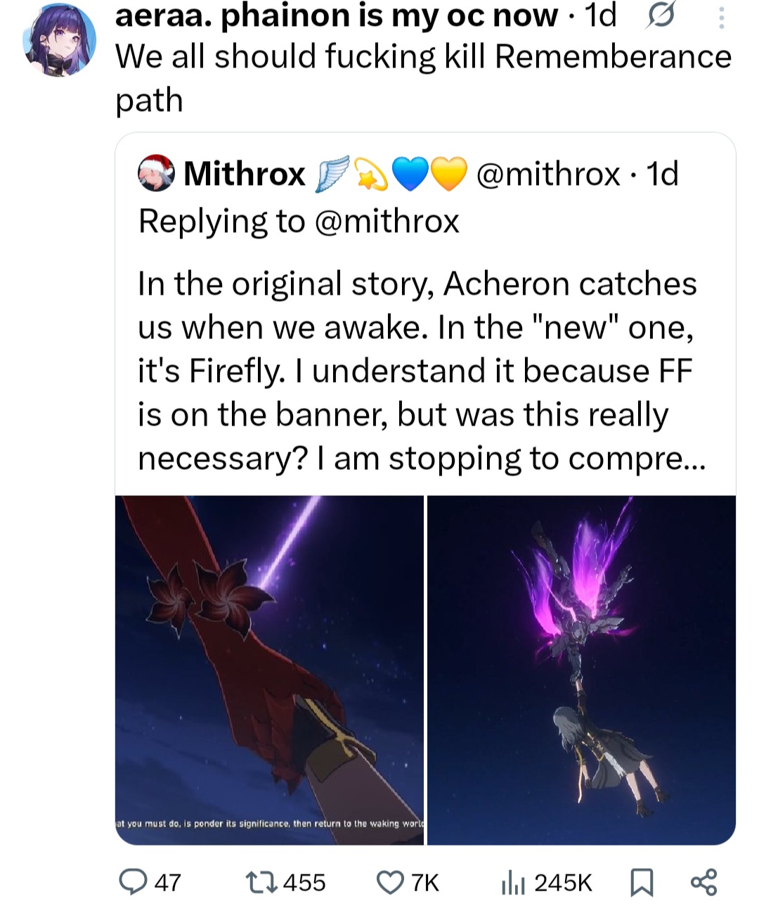 >Kafka: Forget about me and go fuck Cyrene>Acheron: Forget about me and go fuck FireflyBased Shaoji. Thank you for depagging the cool characters.