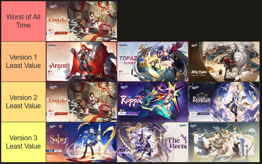 >>550835069Objectively:1.X: Jing Yuan, Blade, Kafka2.X: Sparkle, Lingsha, Jiaoqiu3.X: Mydei, Aglaea, Saber