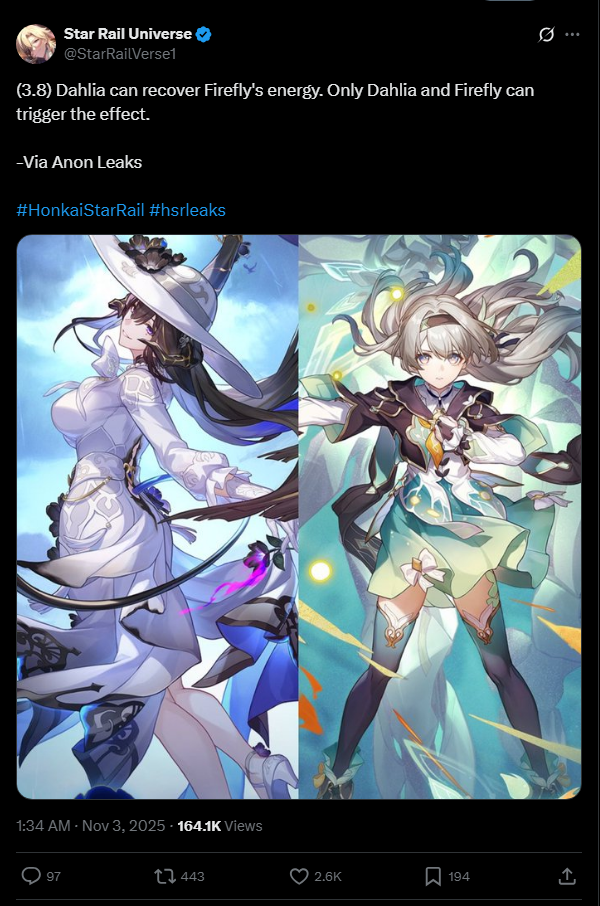 Previous: >>550796319>Download - https://hsr.hoyoverse.com/en-us/home>3.8 Preview Page - https://act.hoyoverse.com/puzzle/hkrpg/rpg_version_page_380_1327/index.html>Version 3.8 Trailer: "Memories are the Prelude to Dreams"https://www.youtube.com/watch?v=dUZl4ssk5Pwhttps://www.youtube.com/watch?v=sWuPj0W7I-I>The Dahlia Character Trailer: "The Final Note"https://www.youtube.com/watch?v=SVeam_lliG0https://www.youtube.com/watch?v=7_hmkhWGbzE>Current Character Banners: The Dahlia, Firefly + Gallagher, Luka, March 7th - https://www.hoyolab.com/article/42790647>Redeemable Codes - https://hsr.hoyoverse.com/gift4TJ9UZ7Z36N7STARRAILGIFT>/hsrg/ Tools & Resourceshttps://rentry.org/hsrg-resources-14>/hsrg/ Thread Templatehttps://rentry.org/hsrg-thread-template-14
