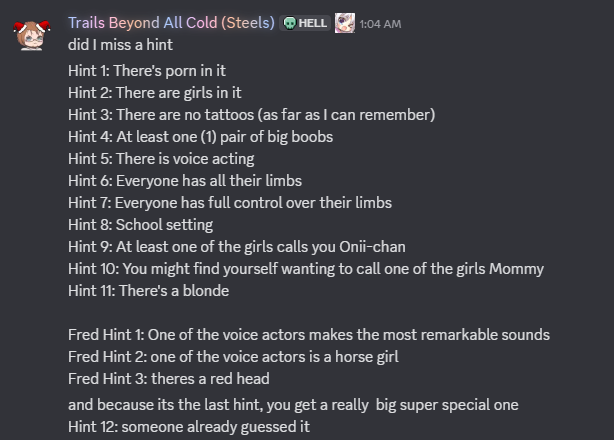 Nekonyan panel is today. They're announcing (at least) 5 new titles.Hints are as follows:Project #1>pic related>"horse girl" means her seiyuu voices one of the trainable characters in the ENG release of uma musumeProject #2>Has a c in the title>existing partnerProject #3>same hints as aboveProject #4>same hints as aboveProject #5>does not have a c in the title>new partner>Official staff reaction to the license internally: Holy shit????>Translated by Steiner (so probably not a moege)> a heroine shares a VA with a character in renai x royale