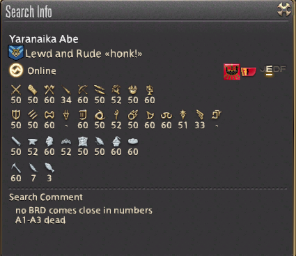 >>550857686Depends what you class as a one trick. I play one job noticeably better than the others that I play more often but have 5 that I am comfortable playing in Crystal.