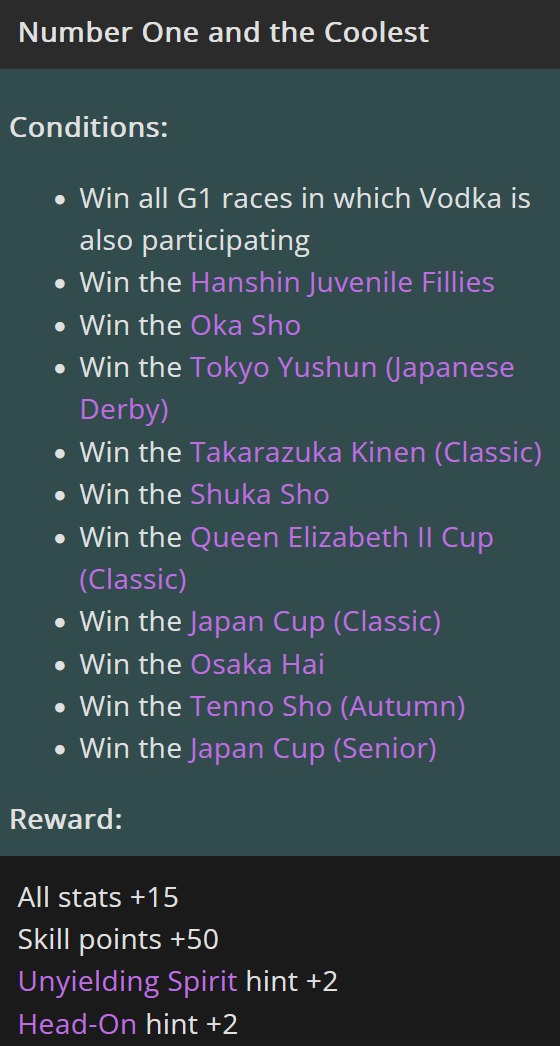 >>550840867You need to win every G1 that Vodka participates in. In addition to goal races, running the derby, there's 5 additional G1s to win. It's not impossibly hard but it's certainly not easy.