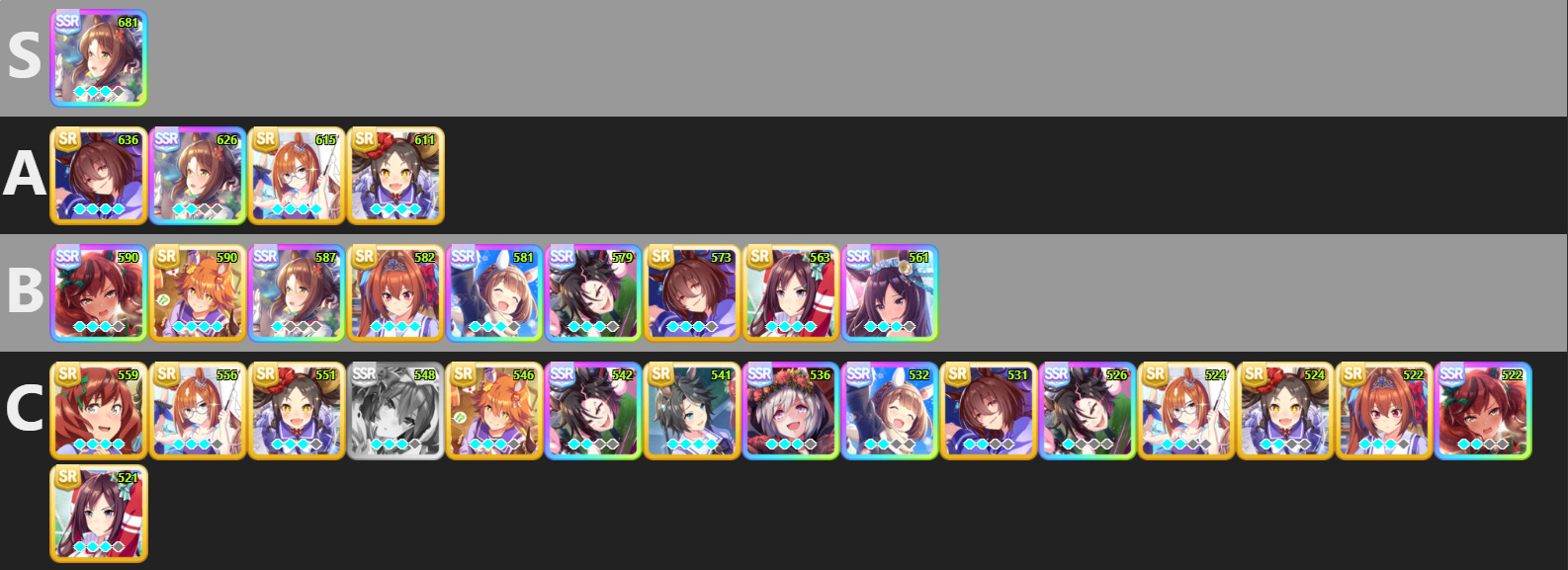 /UMA/ GASLIGHT TIER LISTS-tier - Pretty much unverifiable, claim can be proven or disproven just as easily>X uma is good>You need y skill on your uma to be able to compete>This build will have a high winrate>Future meta predictionsA-tier - Can be disproven, but requires a significant amount of effort to do so>Recommended stamina>Target stats>Current metaB-tier - Takes some amount of effort to disprove>Game mechanicsC-tier - Easily disprovable>Minimum stamina>Skill effects>Which skills work on the course>Course featuresD-tier - Nobody will believe this>Support card effects