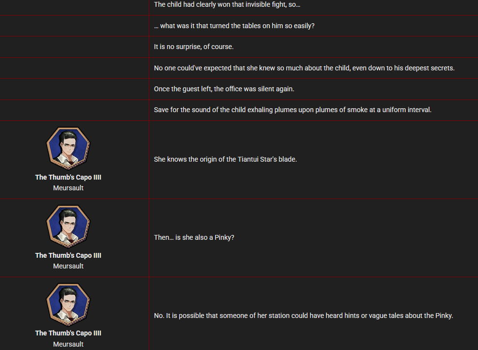 >>550886873>>550887030She is which makes it more funny that Hong Lu is not. She just says it straight up with no ambiguity. >A Heishou may be but a tool… but Faust is different. As a beast of the Heishou - Mao Branch… as a Pinky… I am, with my name restored, a loyal blade and a devoted disciple of my lord. Funfact, if you guys remember they had a mistake with YouHeath's uptie story where he called her tianjiu star by accident and they had to change it.