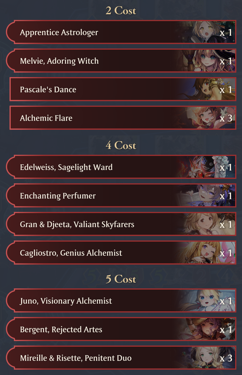 >3x alchemic flare>3x mireille & risette>edelweiss, g&j, perfumer, cagliostrolove playing against constructed decks in take 2
