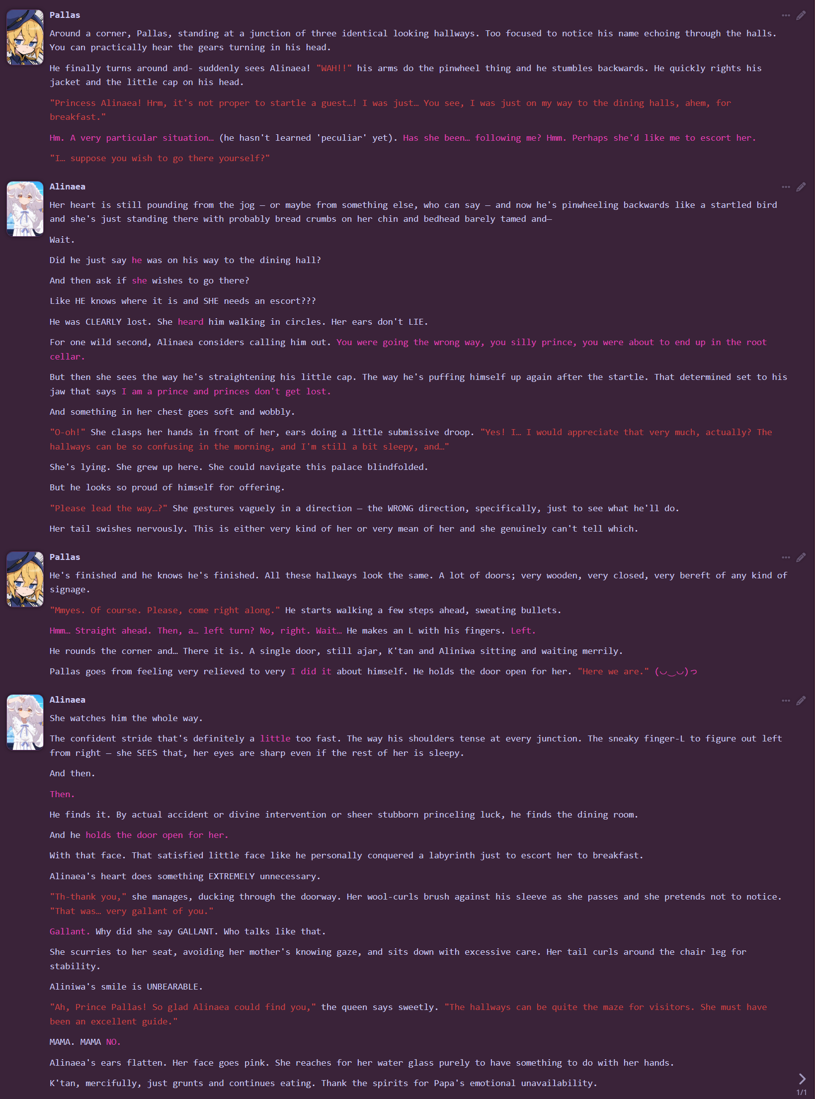 >>550884482Goodmorning! Final shill.Charlotte is your childhood friend/college roommate who's in love with you. Unfortunately for her, she's a beta and you're an alpha and she has a possessive streak. So she took a pill to become an alpha so she can try and bitch you. I am shocked at myself that it took me this long to write an omegaverse bot. This was kind of intended to be fempov/yuri but like Alicia I decided to open it up and make it anypov. Usually I write the description first and then the greeting last minute but I actually wrote the greeting first and then the actual bot second this time. It ended up being one of the longer greetings I've done because of it and I also finished it fairly fast (for my standards).https://chub.ai/characters/uraura/charlotte-12208fe79787https://uraurabots.neocities.org/page1#charlotteFemboy Army is pretty self-explanatory. There's an army and there are femboys in it. Simple. To be specific you are the commander of a random desert army base and you have a ragtag group of 4 soldiers that were each infected by a virus that turns men into femboys. And kills women. Also there's a robot girl. And 6 different greetings because I'm batshit insane and hate myself??? After the first greeting all the other greetings are about two lines long because I couldn't think of anything though. This one's been mostly done for a while but I was procrastinating over the greetings so instead I just gave up.https://chub.ai/characters/uraura/femboy-army-ef994d3b55c8https://uraurabots.neocities.org/page1#femboy_armyYou guys should vote for me for least improved botmakie at the /aicg/ awards.
