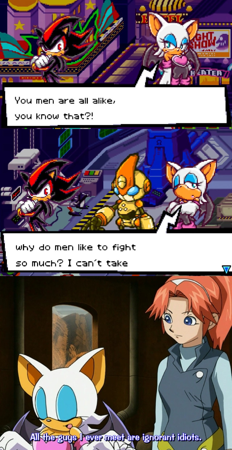 >>550911186Buddy did not play the fucking game. Shadow doesn't talk to Rouge in 05 EVER.