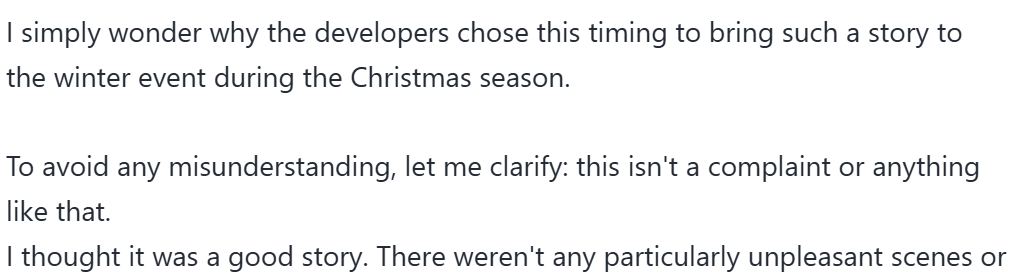 https://x.com/sarrnyan/status/2002354640630002085>yet another post about terminus slop on my feed>its a JP post>its actually longer than usual and its not just crying emojis>read the translation>surprised to see how shit this event was that it made even a JPblud (probably less likely to complain about the story) get disillusioned and see past the kdramaslop and point out its flaws like how its not a Christmas event and how blanc etc weren't in the event or how they didn't give a conclusion for the ark PR disaster that would follow after the one operation where they sent out ONE civilian to the surface on the AZX would be for the central government since at the start of the event there was a whole crowd of news reporters gathered at the station and it was an operation to discover resources and advertise the surface as a safe placeit always makes your soul re-enlighten when you discover other people are capable of sentience and seeing past the circus' curtain. I hope this trend continues.more people need to wake up. discussion won't bring any fruit if there isn't a big enough backlash & chimpout to follow with it and maybe we'll have a good year like year2 or Shiftup keeps churning out slop. if JP gets riled up a little it could snowball and take off from there and spread. but all I've seen is that they care more about surface and dorm than egghood's attempt at a booker prize. at the moment Global stands divided but its just noise at the end for Global.those with access to the relevant SEA/JP/Arca channels please Weigh in thanks for reading my reddit post please updoot