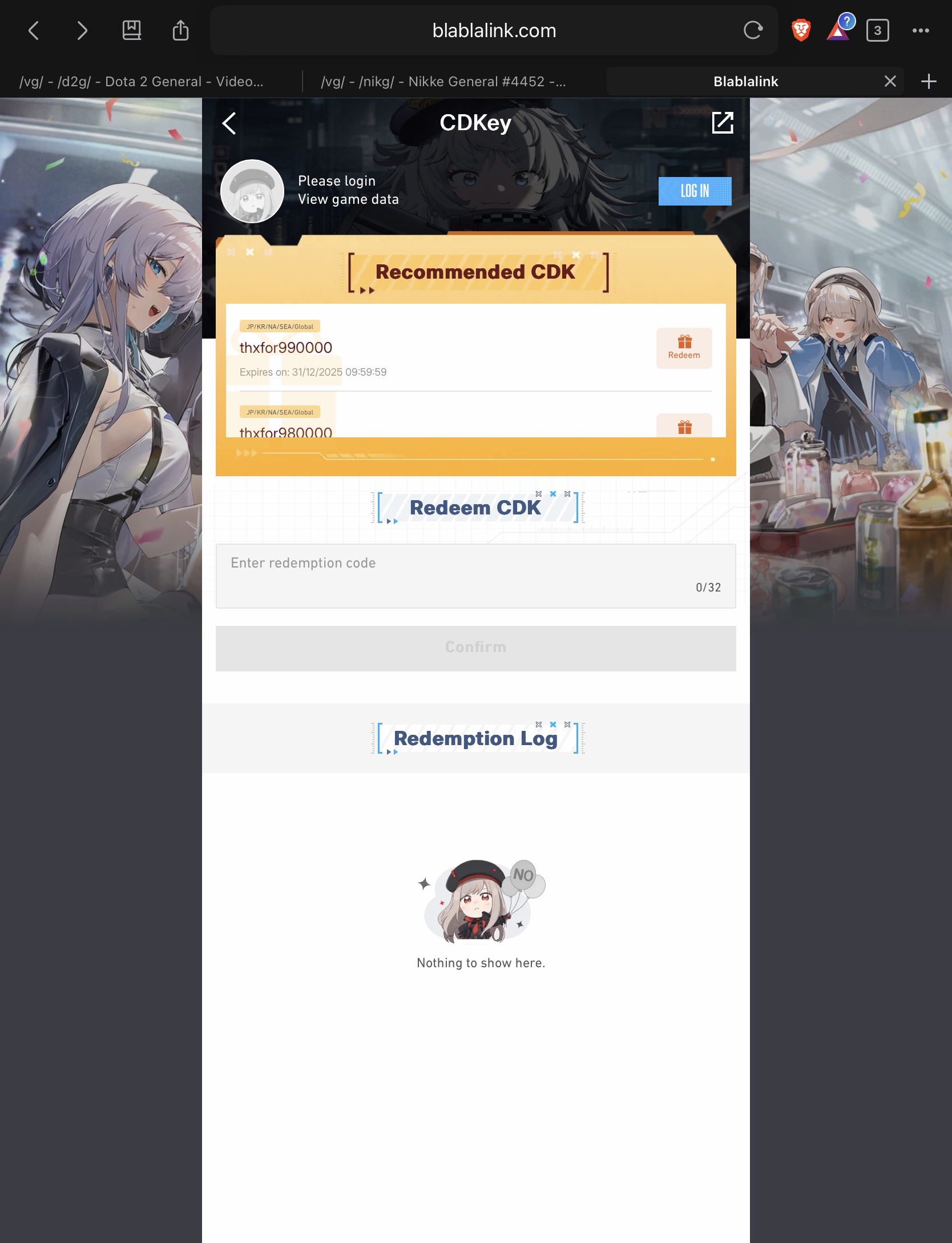 >Game Download - Android/iOS/PChttps://nikke-en.com/index.html>General Info/FAQ for New Playershttps://rentry.org/NikkeInfo>Additional Linkshttps://rentry.org/nikghomeALL DATES/TIMES LISTED BELOW ARE UTC+9 (KOREA TIME)>Update on December 4https://nikke-en.com/newsdetail.html?content_id=254d33c5af95fa4a26aa933a5020c508da59>Developer's Note: December 2025https://nikke-en.com/newsdetail_m.html?content_id=cdd4dd28a9a71a464ca8afdac52e5bb9b7fb>Latest Developer QA interviewhttps://pastebin.com/M0E4MDUq>Current EventsTERMINUS TICKET - December 4 ~ December 30>Upcoming EventsTBA>Current Special RecruitsDiesel: Winter Sweets - December 4 ~ December 25Maiden: Ice Rose & Guillotine: Winter Slayer [Rerun] - December 4 ~ December 25Brid: Silent Track - Dec 11 ~ Dec 31>Upcoming Special RecruitsTBA>Current Costume PassesBlanc: Fortune Express [Gacha] - December 4 ~ December 30Bready - Frosty Bite [Mission Pass] - December 4 ~ December 30Emma - Color Me Red, Vesti - Ark Mage & Volume - Beat the Gun [Shop rerun] - December 4 ~ December 30Jackal: Class Troublemaker [Mission Pass] - Dec 1 ~ Dec 31>CodesNIKKEASSEMBLE3RD3YEARSWITHNIKKEGODDESSASSEMBLEPUNYQUEENIAMNAYUTA3YEARSWITHCOMMANDERthxfor990000thxfor980000thxfor970000thxfor960000DWAVECOMINGPrevious: >>550824473