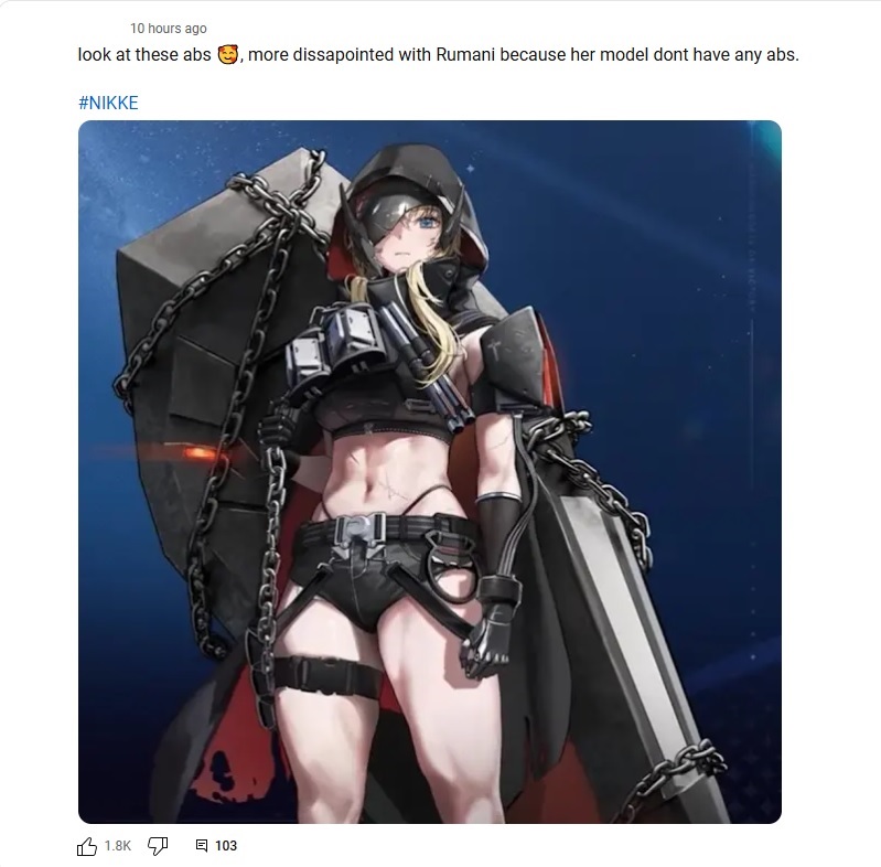 >>550952119It was probably more having to do things like Smile Time than people saying mean things online.Anis and her buddies had to put up with some shit, and Anis being a massive doomer is just part of her outlook post showbiz. Its easy to trigger that and doom scrolling has become worse recently.>>550952353>Make Nikke biblical.Lol, no.That's an awful idea.
