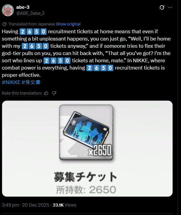 >>550940124And it's not like it was just the global side shouting at them in the dev notes like other times. The JP side was really mad at them for surface mode as well. I won't be surprised if they had to do some damage control this time instead of straight up ignoring all feedback like usual.https://x.com/NIKKE_japan/status/2000473314586931274