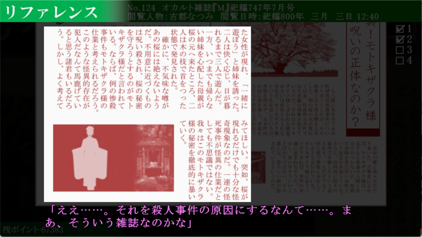 They keep mentioning the big sakura tree that appeared out of nowhere 60 years ago, and how there's an identical one in Arata village. I still have absolutely no idea how the sakura trees - or the sound that heralds the end of the world - has anything to do with what is otherwise a fairly contained murder mystery. Like, genuinely not even a clue of how these could possibly be related. Considering we already have a super drug, I guess it'll have to be some kind of magic? I can't think of anything else.