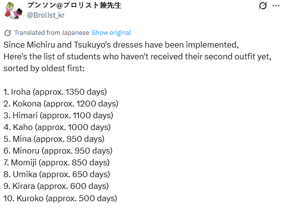 Previous Thread: >>550935204>Guides, Resources and useful links:https://rentry.org/bagguides>/bag/Circles/Clubs/Friends:https://rentry.org/holdingthebag>4koma, Manga, Side Content, PVs & Shortshttps://rentry.org/bacontent>>(JP) – JST>Banners:>12/17 11:00 – 12/24 10:59Meru, MomijiMinoriShigure (Hot Spring)Serika (Swimsuit)>12/24 After Maint – 1/7 10:59Tsukuyo (Dress)Michiru (Dress)>News:5th Anniversary Website: https://5th-anniversary.bluearchive.jpPatch notes: https://bluearchive.jp/news/newsJump/609>Events:Balancing Schale's Books with the General Student Council – 12/17 11:00 – 12/24 10:59不忍ノ道~ファッションショー警護任務!の巻~ - 12/24 After Maint – 1/7 10:59>Content:Total Assault: Hovercraft (Field) – 12/31 11:00 – 1/7 3:59Limit Break Assault: Chokmah (Outdoor) – 11/20 11:00 – 12/24 3:592x Commission – 12/17 4:00 – 12/24 3:592x Bounty – 12/24 4:00 – 12/31 3:592x Account EXP – 12/27 4:00 – 12/29 3:592x Normal/Lesson – 11/26 4:00 – 12/3 3:59>>(GLOBAL) – UTC>Banners:>12/16 After Maint – 12/23 1:59Hasumi (Swimsuit – Limited)Seia (Swimsuit – Limited)Ichika (Swimsuit – Welfare)>News:Patch notes: https://forum.nexon.com/bluearchive-en/board_view?thread=3302503Roadmap: https://bluearchive.nexon.com/events/2025/12/4th>Events:Summer Sky's Promise – 12/16 After Maint – 12/30 1:59100-Free Recruitment Event: https://forum.nexon.com/bluearchive-en/board_view?thread=3302497Teatime on the Beach: https://bluearchive.nexon.com/events/2025/12/teapartyMy Office: https://bluearchive.nexon.com/user/myofficeSpecial Survey: https://forms.gle/4DaM3bvLkqAkvX7q9Discord Quest Event: https://forum.nexon.com/bluearchive-en/board_view?thread=3274080>Content:Total Assault: Hod (Urban) – 12/23 2:00 – 12/29 18:59Limit Break Assault: Tiphareth (Indoor – w/Heavy Armor) – 12/17 2:00 – 1/12 18:593x Bounty/Lesson – 12/15 19:00 – 12/22 18:592x Account EXP – 12/19 19:00 – 12/21 18:593x Normal – 12/22 19:00 – 12/26 18:592x Account EXP – 12/26 19:00 – 12/28 18:59