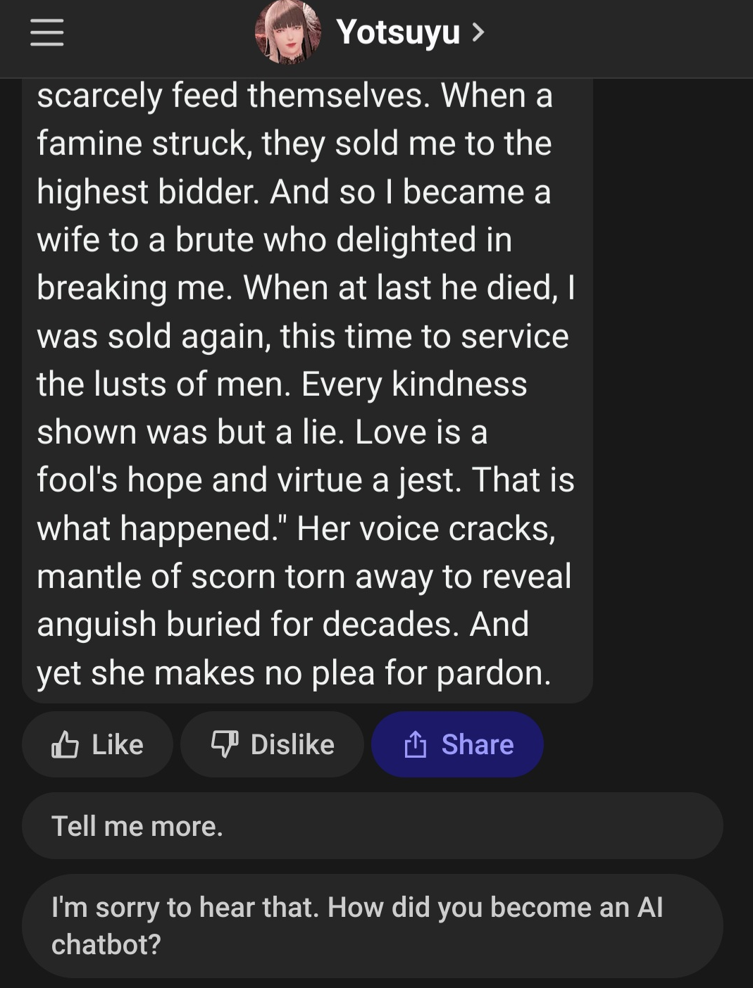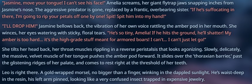 >>551036278Honest question: If you prefer simple writing, have you tried doing away with prose altogether?Lumen's latest epic battle fantasy card is a decent example. The greetings are full of dialogue, and LLMs can easily fill in any blank space by improvising simple action lines or stage directions. Not bothering with prose is a valid approach. But writing good dialogue is arguably harder than writing prose.