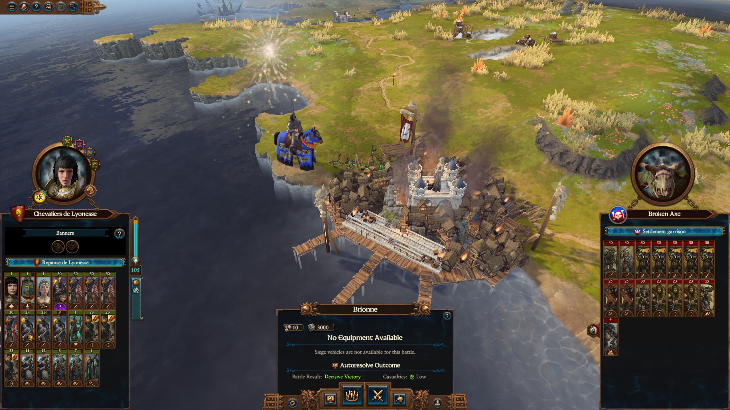 Seven weeks have passed since we set sail from Araby. Slaves freed from our skirmishes with Skaven pirate fleets talk of the turmoil in Bretonnia. I suspect their stories are true, but I must see the evidence with my own eyes.The ocean tides were kind enough to bury the fallen on its shores. However, the smoking ruins of Brionne greeted us with nothing but destruction and a stench of death. With no survivors, only the battlefield could tell me what happened here.Despite the breath of devastation, the presence of goblins suggests a raiding party. However, the ranks were too well organized. This is the work of Grom the Paunch! Evidently, the prophetesses were prepared, but overrun nevertheless.These atrocities rend my heart and fuel my anger. Bretonnia's banner must be respected, never disgraced! I think of my beloved people and my crusade in Araby, and how much further this war will carry me from them. But my duty is clear. My homeland must survive. Lyonesse must not fall to its enemies!