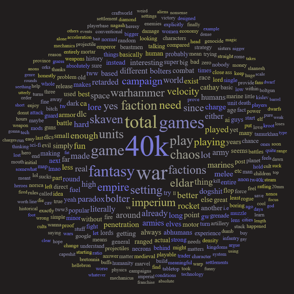 >>551082724>literally a chat about 40k and anons playing TWW3 in peace while having discussions aroundyeah go piss somewhere else
