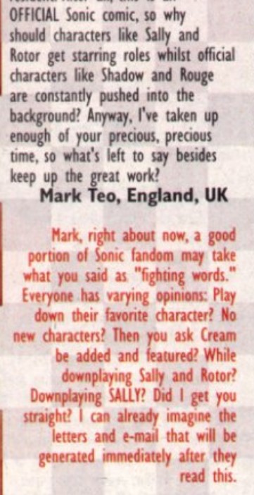 Sonic and Sally didn't even get married though. It's common knowledge by now that that was an offshoot continuity. We know this because whenever someone says the same thing about Tails and Honey people point out that it was in that very offshoot continuity. Archie Sonic and Sally never actually grow into adults, they get rebooted and their relationship gets put down permanently.