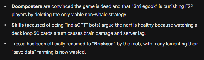 ##General brainrot##Lore vs. Coom: Players are torn between wanting a dark, edgy "Eldritch Horror" story like Limbus Company and just wanting to see their waifus get "mindbroken" (a mechanic the thread is obsessed with).##Other Gachas: WuWa (Wuthering Waves) refugees are getting roasted, and there’s a constant fear that Arknights: Endfield will mog this game into oblivion.##The Verdict: The game is simultaneously "WINNING SO HARD" and "EOS SOON," depending on who you ask.TL;DR: Tressa is bricked, Sereniel is a wife, and if you don't have Chains, you're ngmi, bwo.