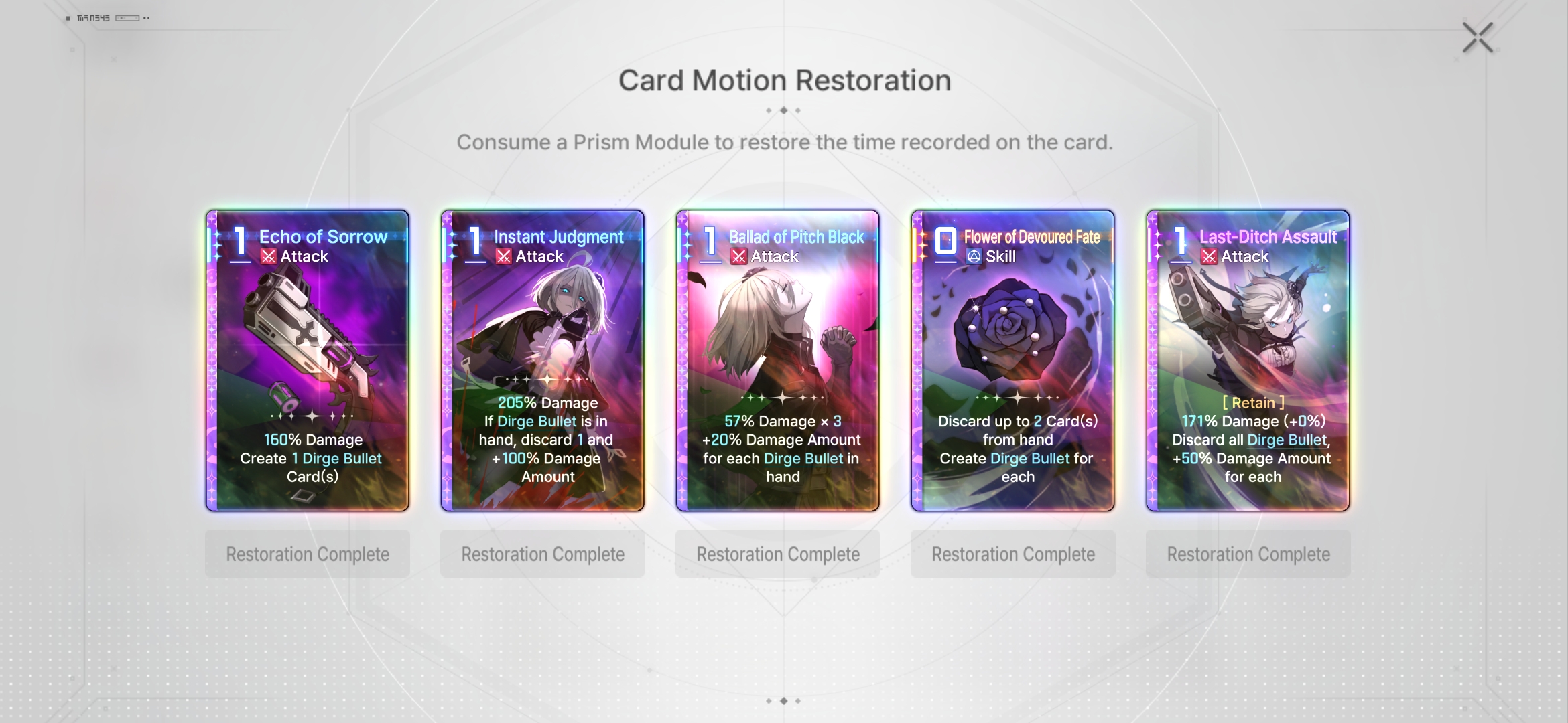 I finished renoa's card restoration.Its annoying her dirge bullets and basics dont have anything,but at least you usually remove the basics.