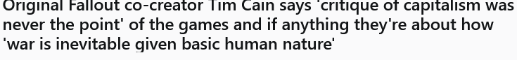 >>551321943You could say that there some themes about corporatism in game, although, really less so about House but more so about Vault Tec. But they are more relevant as lore background, and more so if only you believe that Vault Tec instigated the war. Otherwise games themselves, in their timelines, tend to focus on other things. At they core they are about being a dumpster diving looter and some schizos and or powerbrokers/factions of various ideologies doing their thing.