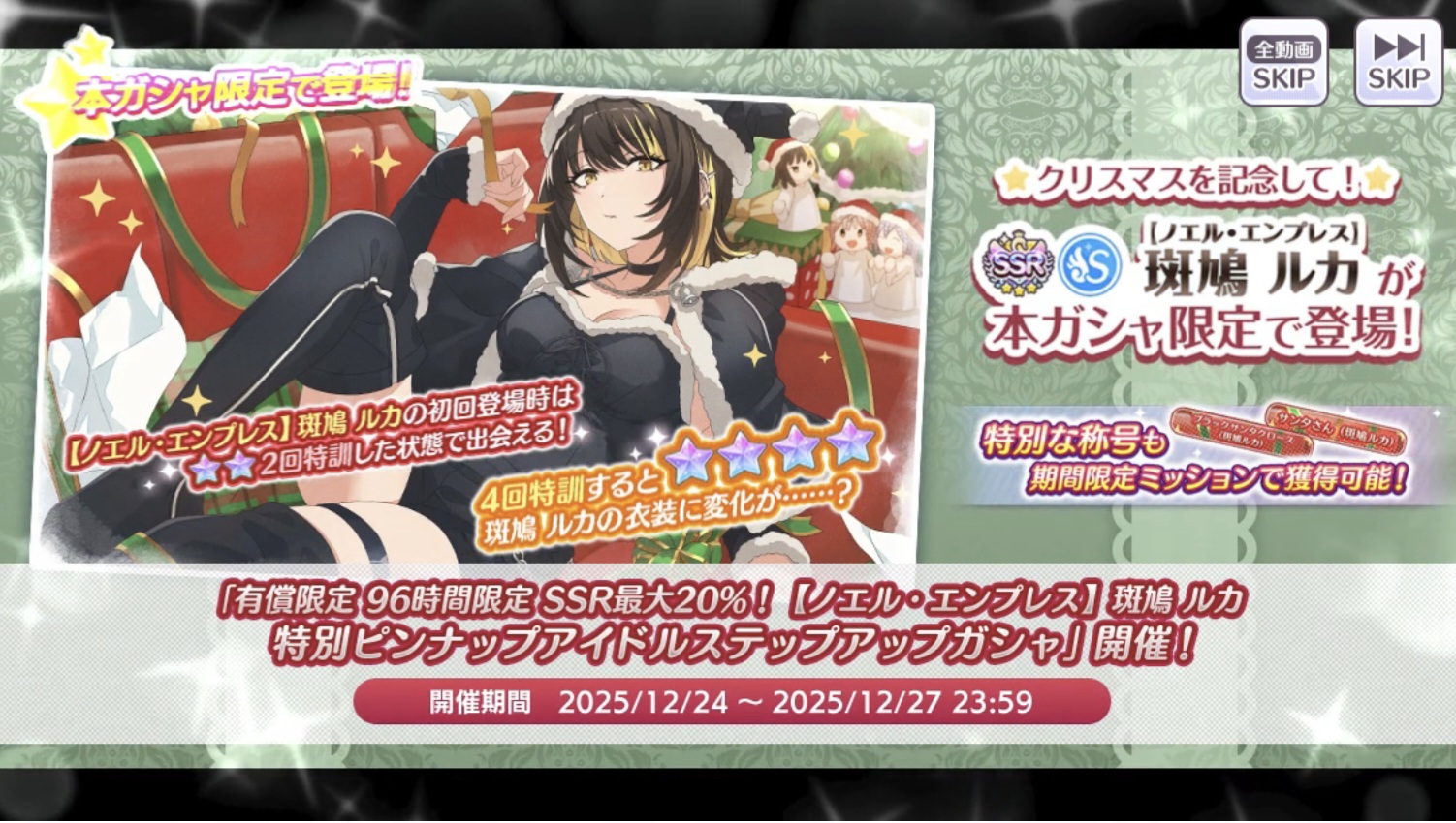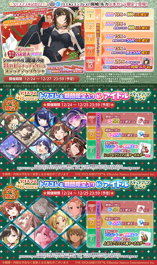 Coal for everyonePaid Jewel Up to 20% SSR Rate Christmas Luca Step-Up Gacha:S-SSR「【ノエル・エンプレス】Ikaruga Lucahttps://twitter.com/imassc_official/status/2003481597929226474?s=20Piece Package:https://twitter.com/imassc_official/status/2003481723900669992?s=20Paid Jewel 48-Hour Twicolle/Limited P-Idol Christmas Step-Up Gacha, comes with bonus item at Step 3:https://twitter.com/imassc_official/status/2003480969140142198?s=20Paid Jewel 48-Hour Twicolle/Limited Support Idol Christmas Step-Up Gacha, comes with bonus item at Step 3: https://twitter.com/imassc_official/status/2003481220378972639?s=20