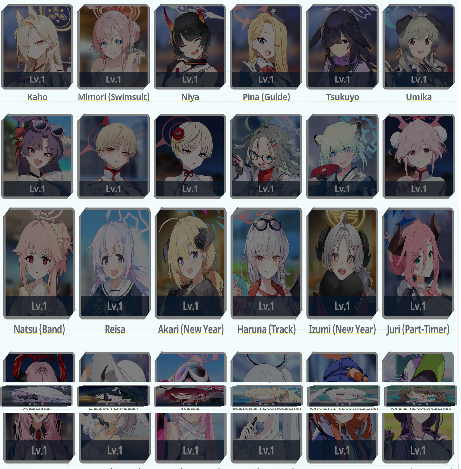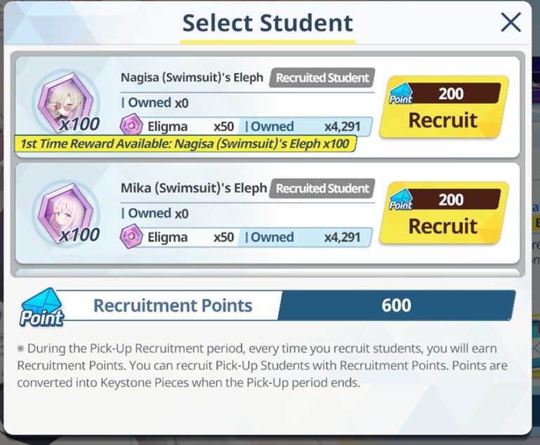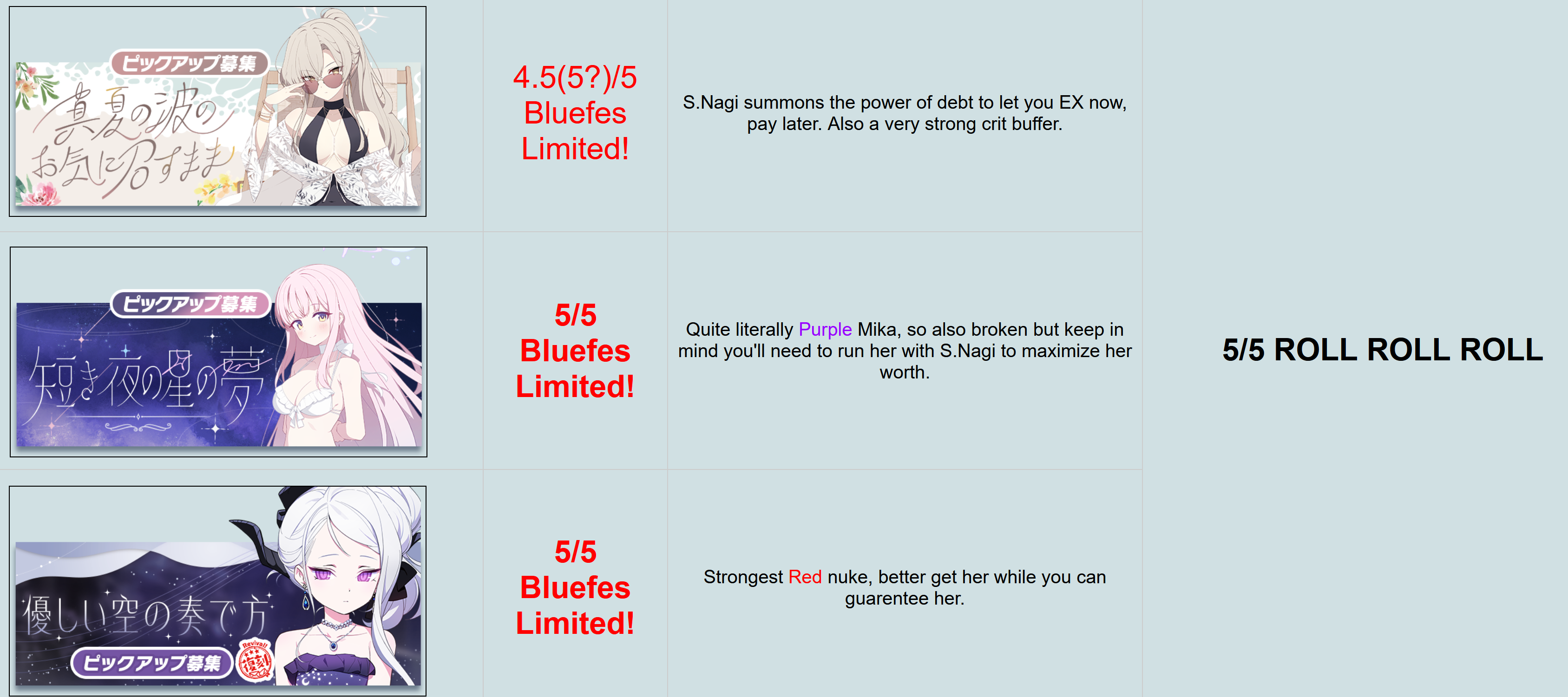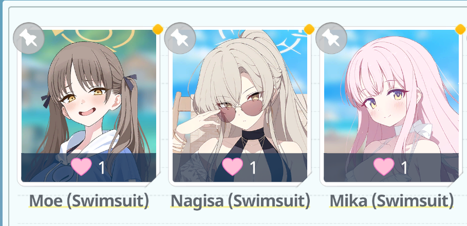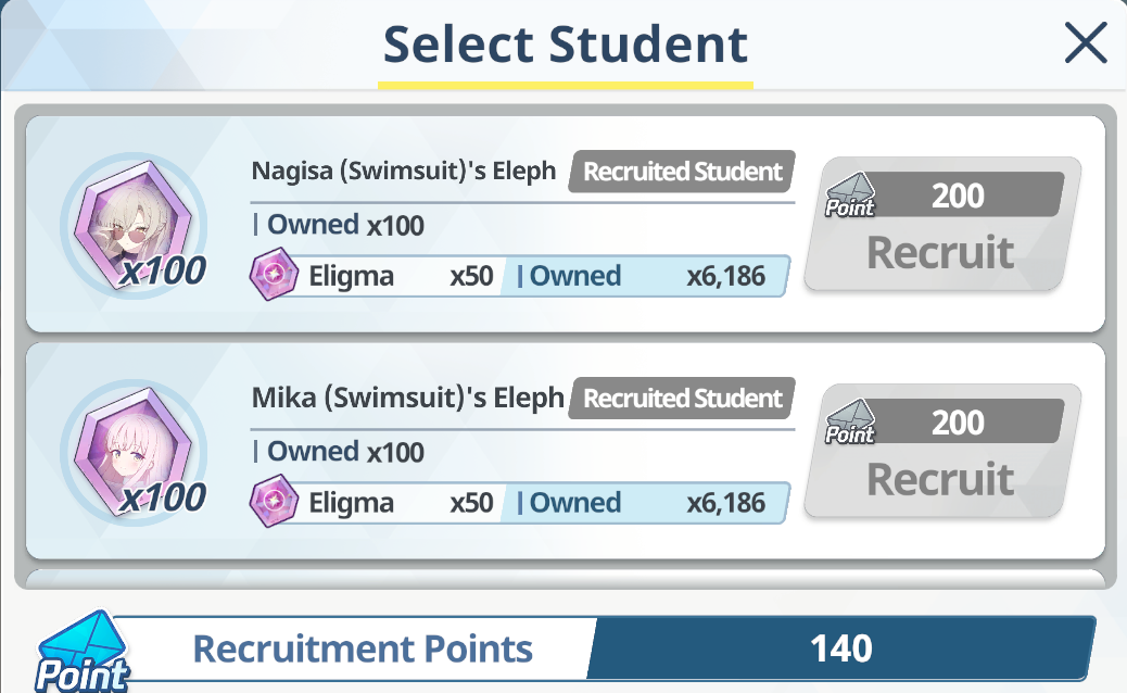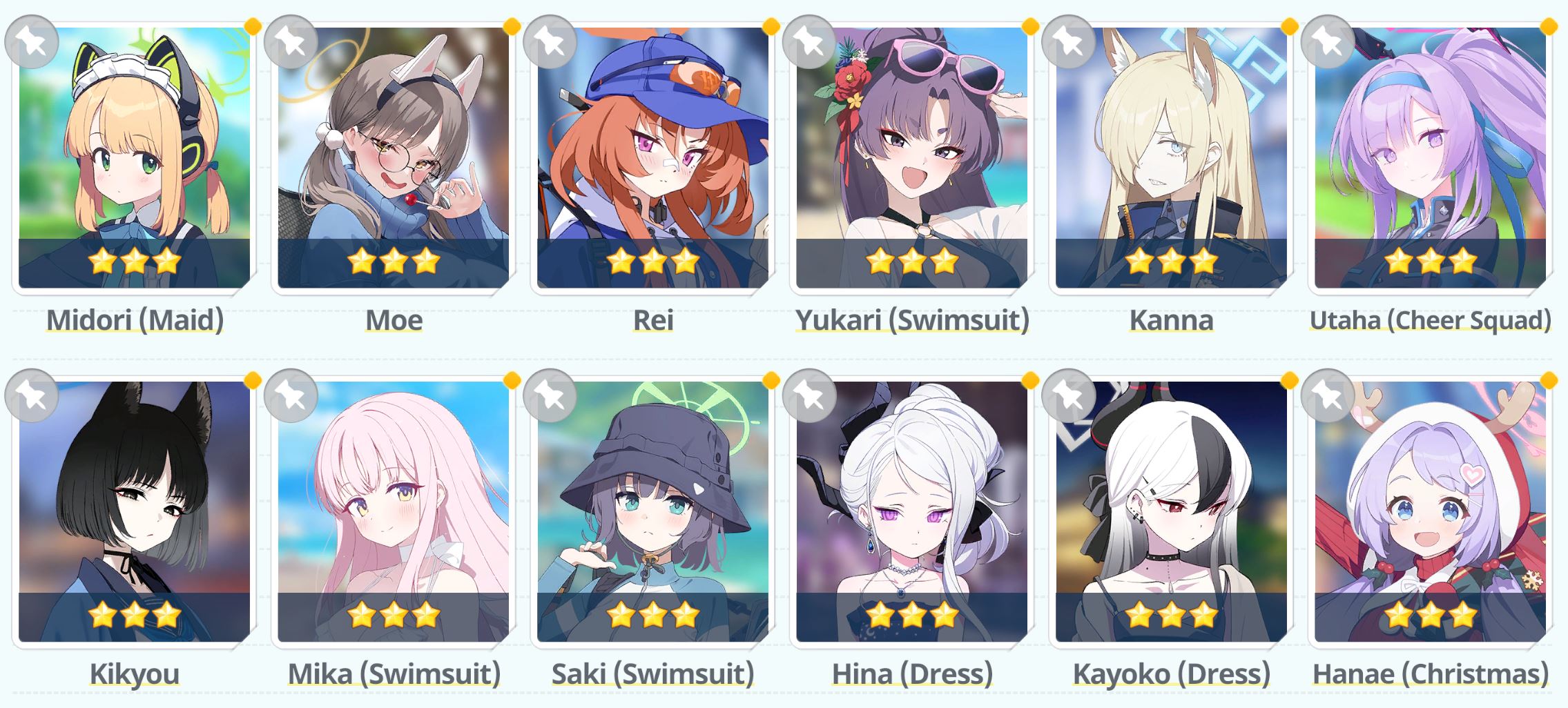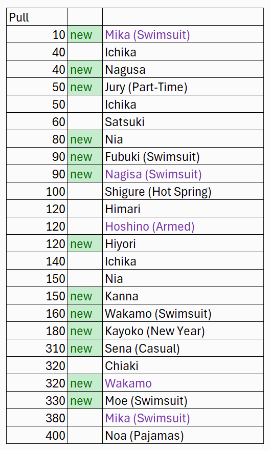 So in 20 rolls I've gotten- Normal Mika- Swimsuit Mika- Swimsuit Nagisa- Swimsuit Shiroko- New Year Akari- Armored Hoshino- Wakamo- Bunny AkaneI'll spend the points on Hina but I guess I should keep going and take advantage of the fest right? I saved like 54,000 for this. Can I get Kikyou and Yukari here? Maybe S Hanako (my purples are weak)