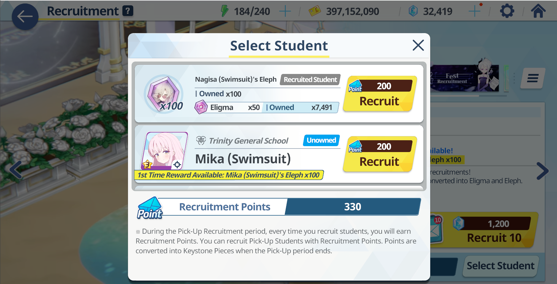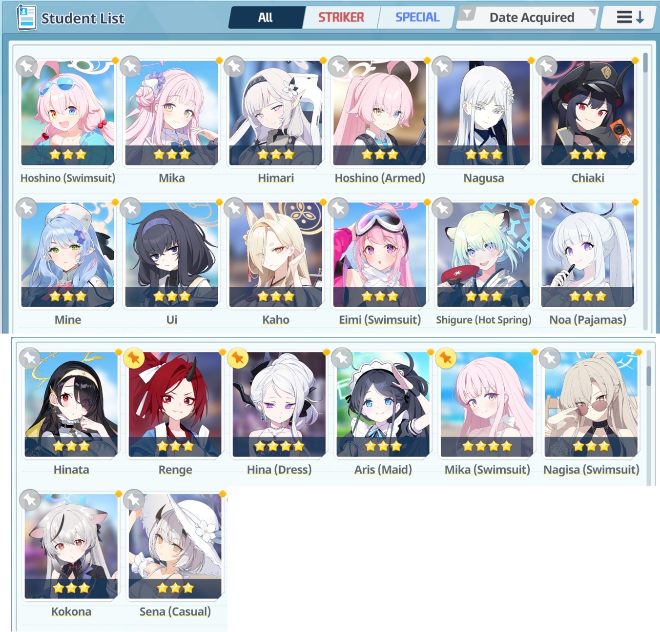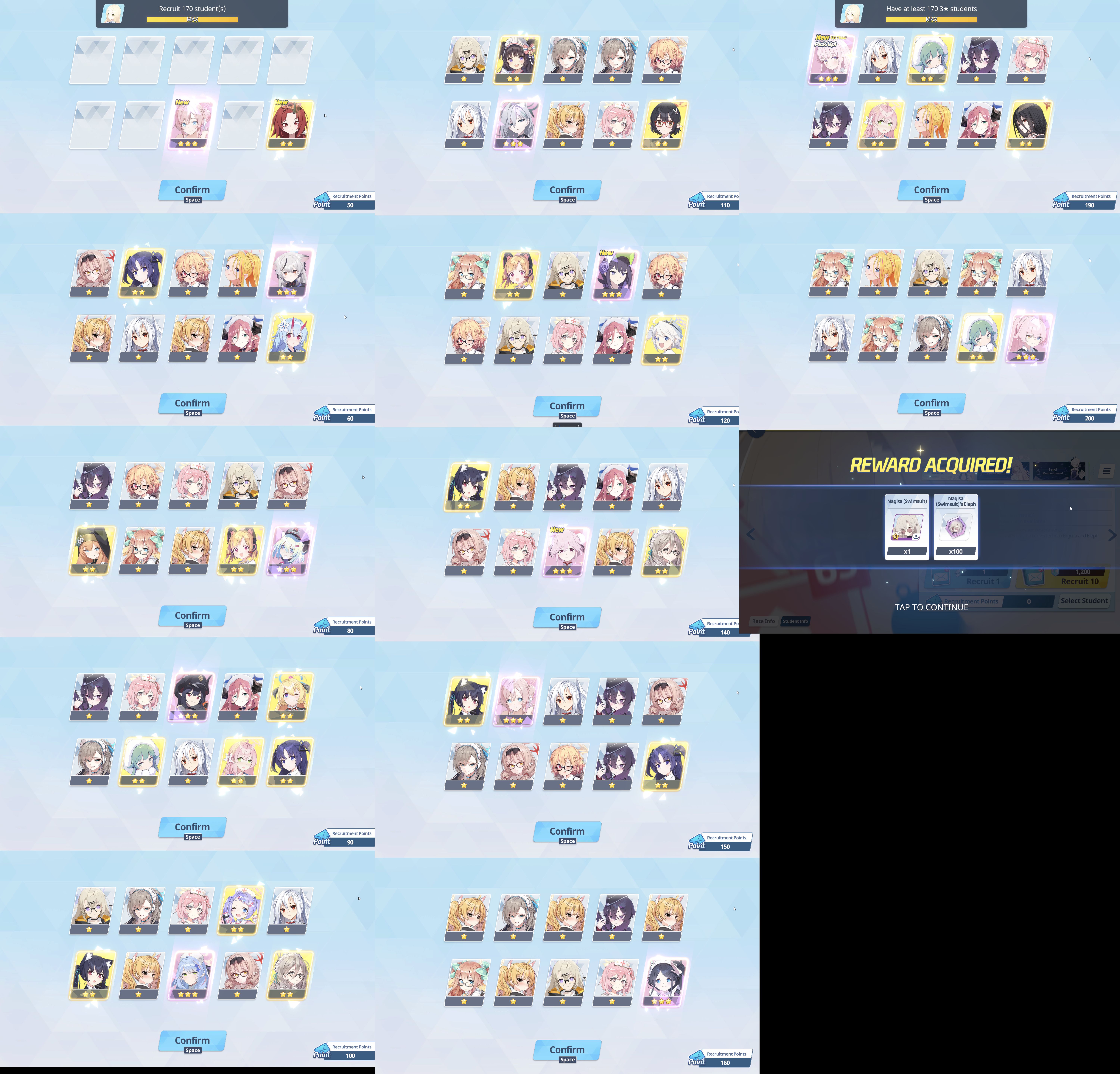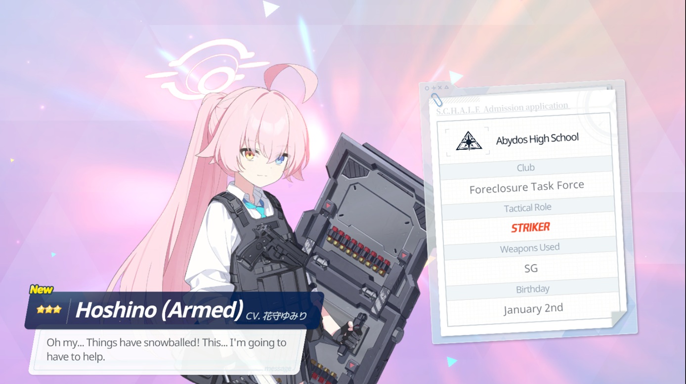 So in 20 rolls I've gotten- Normal Mika- Swimsuit Mika- Swimsuit Nagisa- Swimsuit Shiroko- New Year Akari- Armored Hoshino- Wakamo- Bunny AkaneI'll spend the points on Hina but I guess I should keep going and take advantage of the fest right? I saved like 54,000 for this. Can I get Kikyou and Yukari here? Maybe S Hanako (my purples are weak)