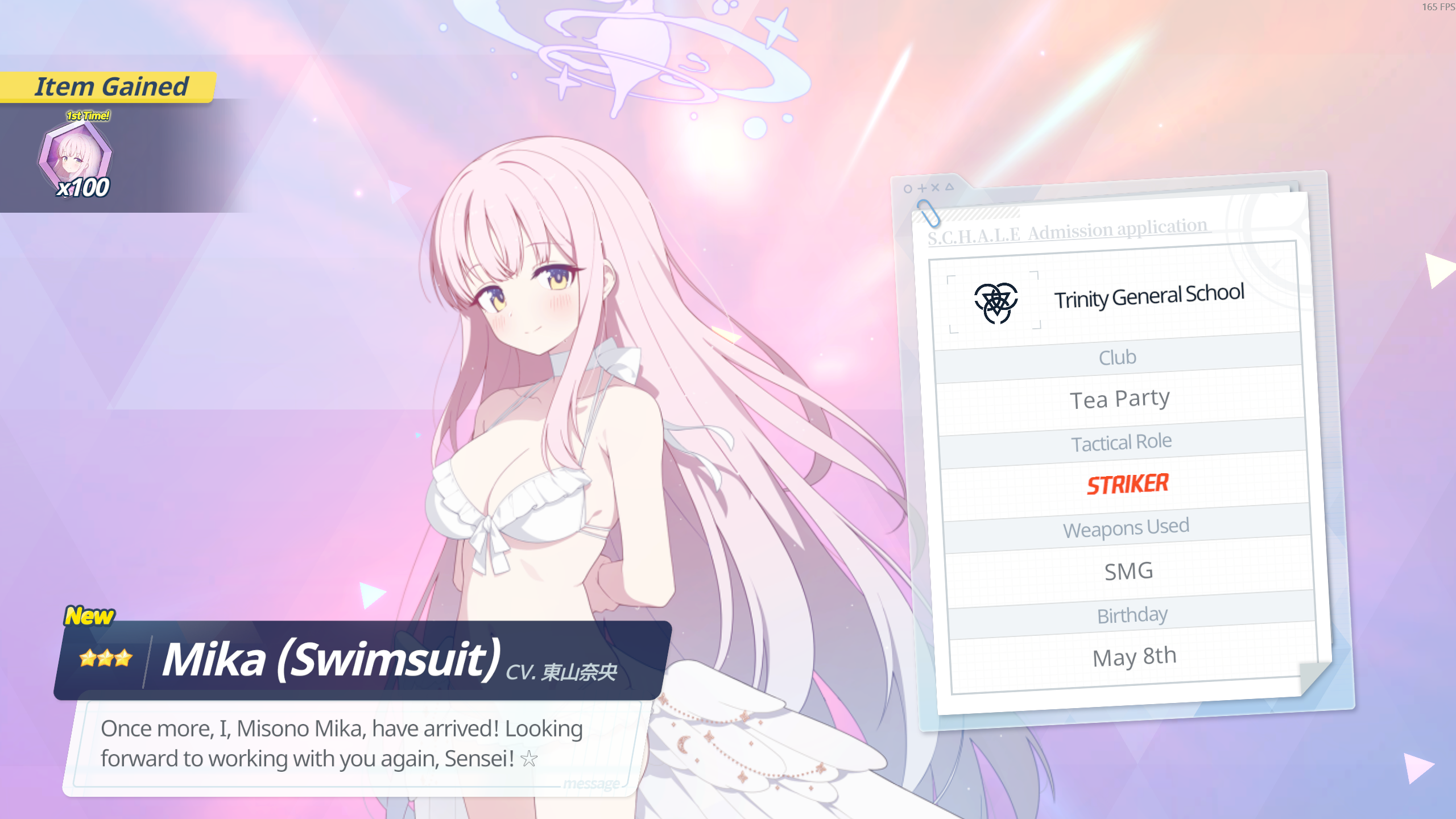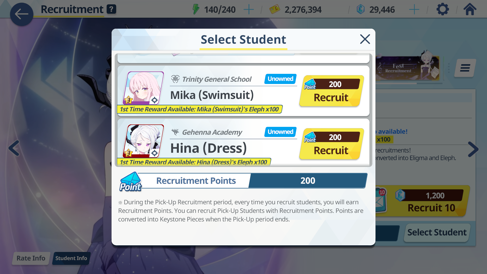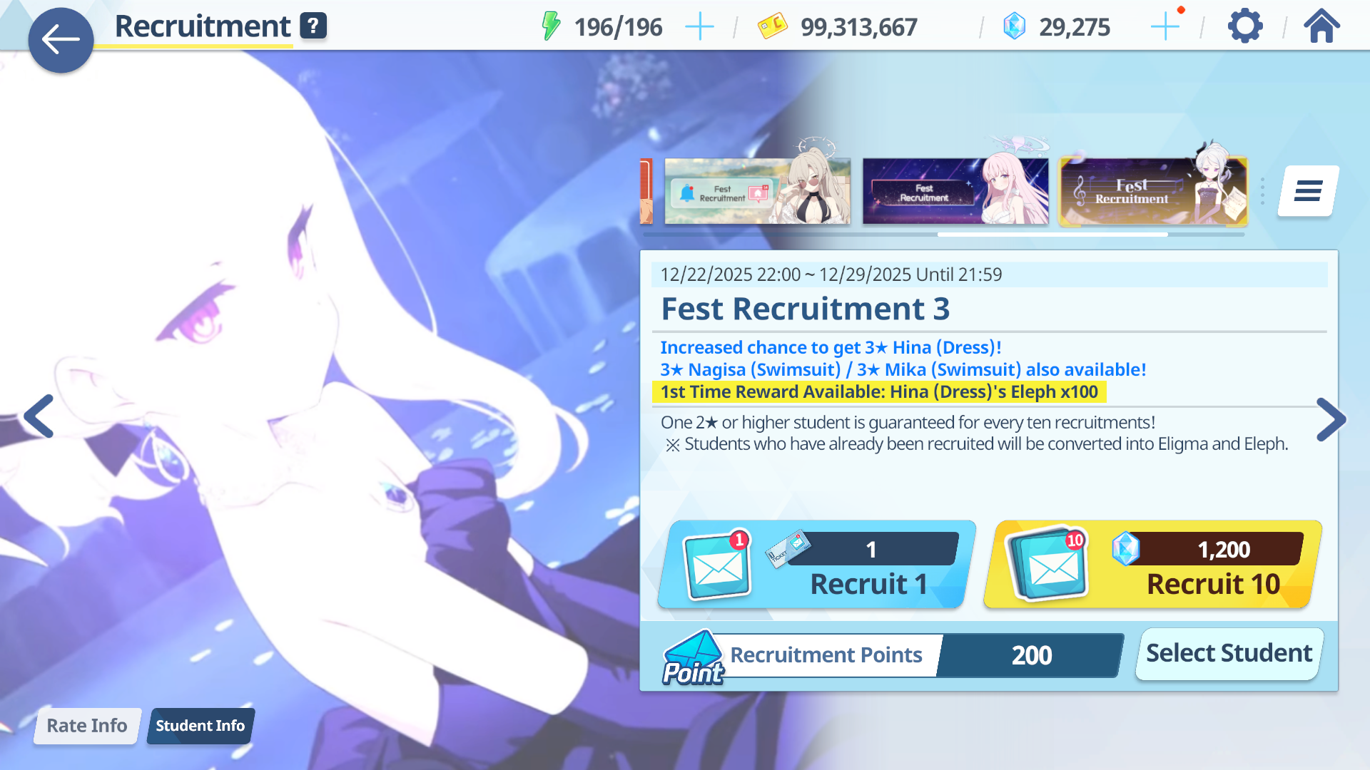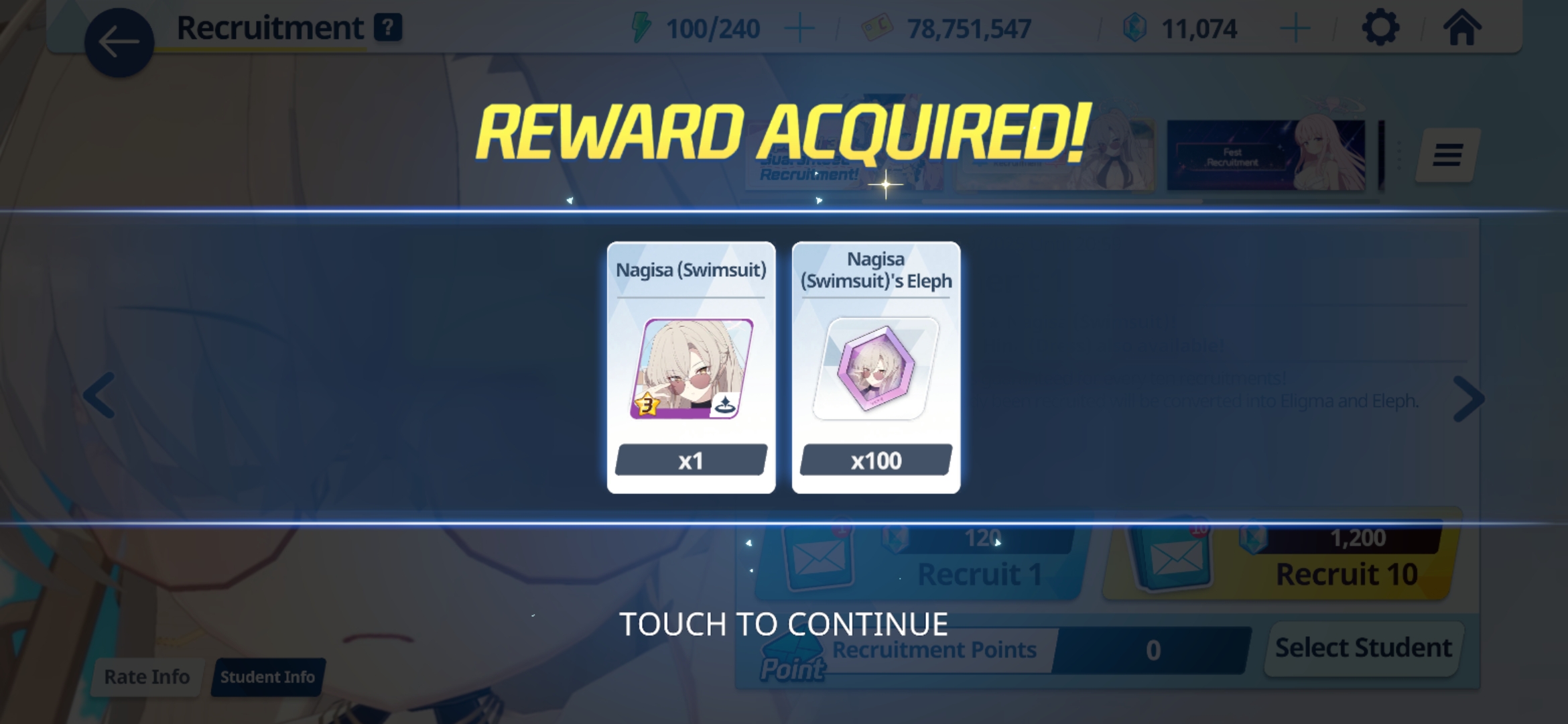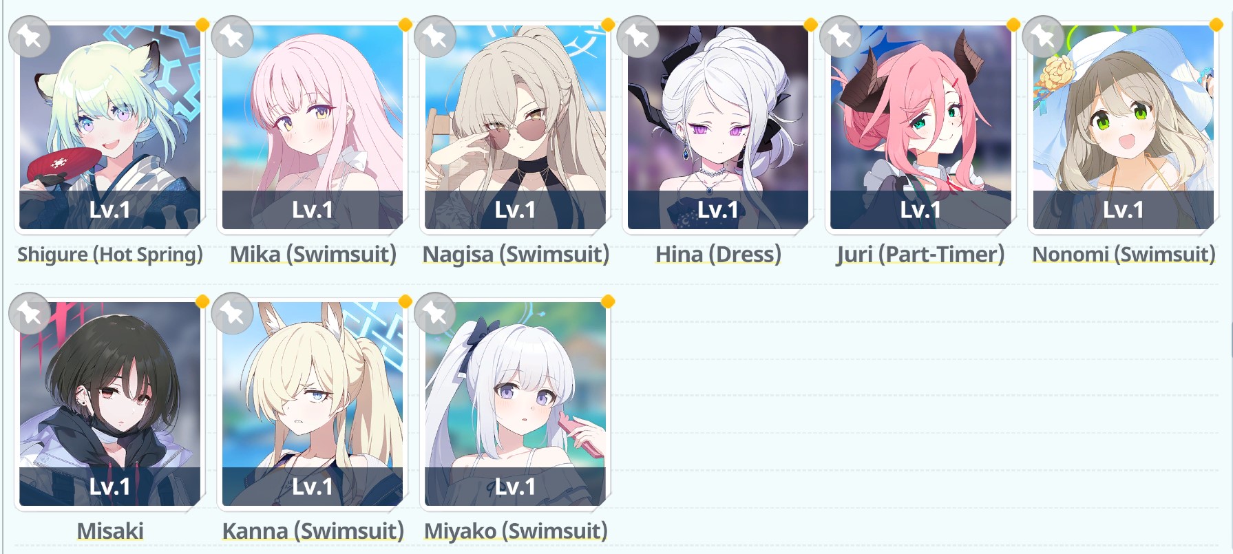 So in 20 rolls I've gotten- Normal Mika- Swimsuit Mika- Swimsuit Nagisa- Swimsuit Shiroko- New Year Akari- Armored Hoshino- Wakamo- Bunny AkaneI'll spend the points on Hina but I guess I should keep going and take advantage of the fest right? I saved like 54,000 for this. Can I get Kikyou and Yukari here? Maybe S Hanako (my purples are weak)