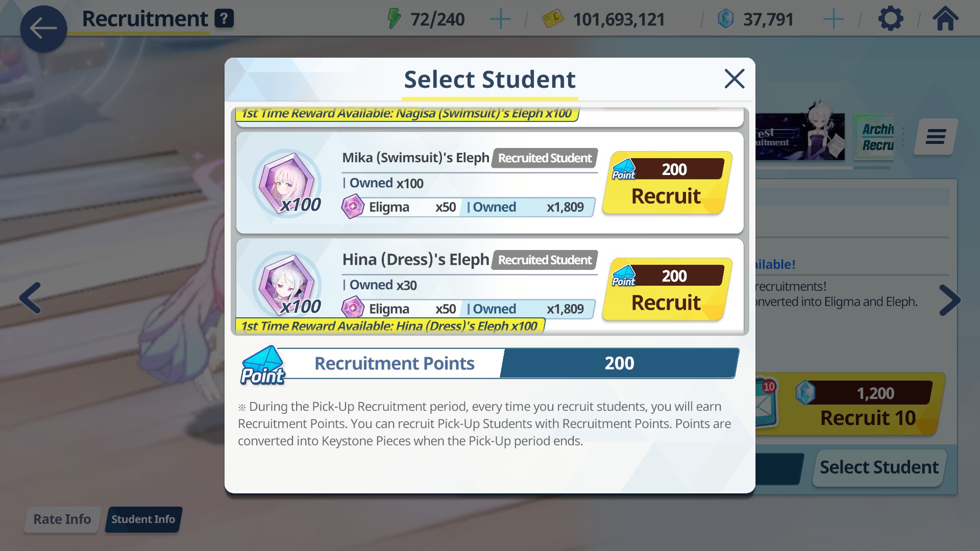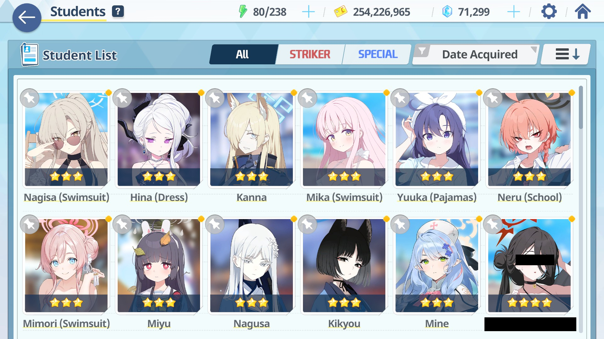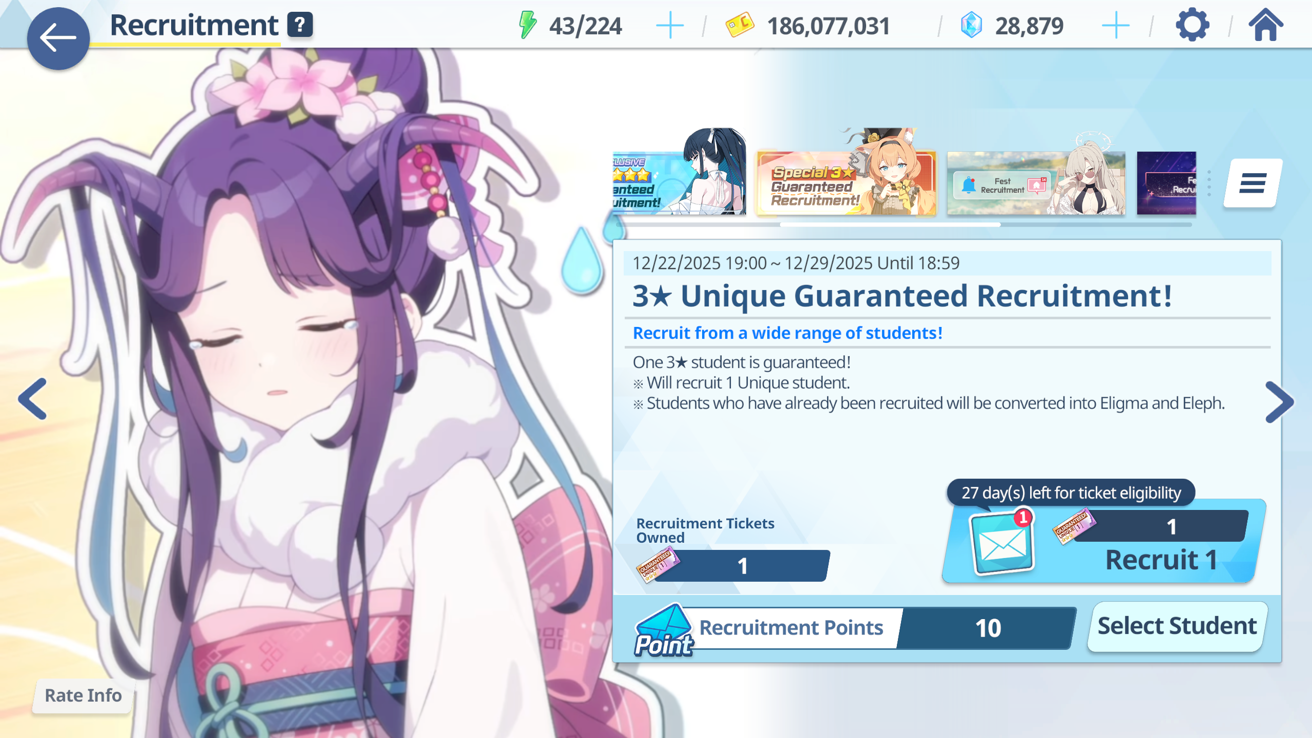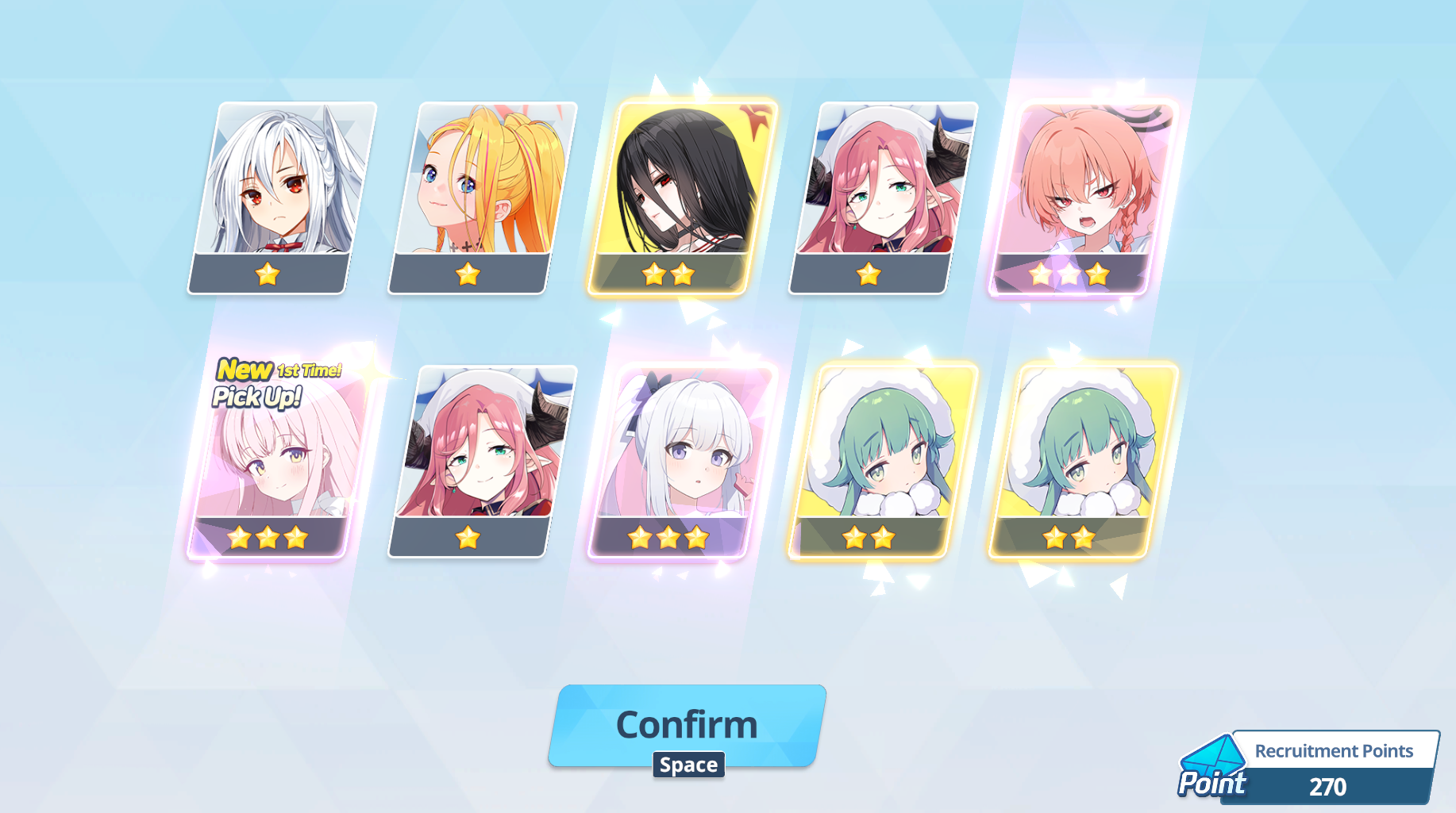So in 20 rolls I've gotten- Normal Mika- Swimsuit Mika- Swimsuit Nagisa- Swimsuit Shiroko- New Year Akari- Armored Hoshino- Wakamo- Bunny AkaneI'll spend the points on Hina but I guess I should keep going and take advantage of the fest right? I saved like 54,000 for this. Can I get Kikyou and Yukari here? Maybe S Hanako (my purples are weak)