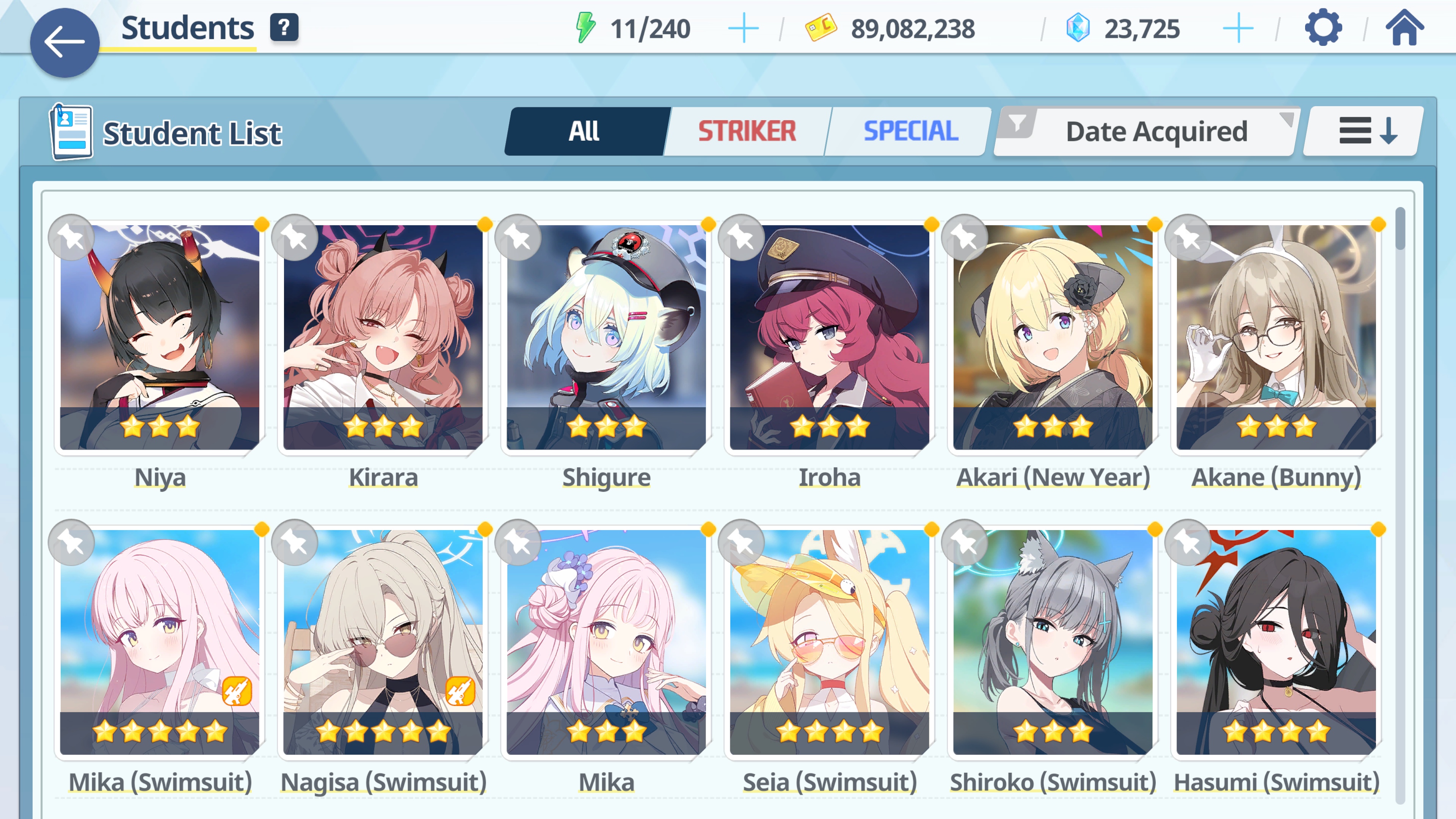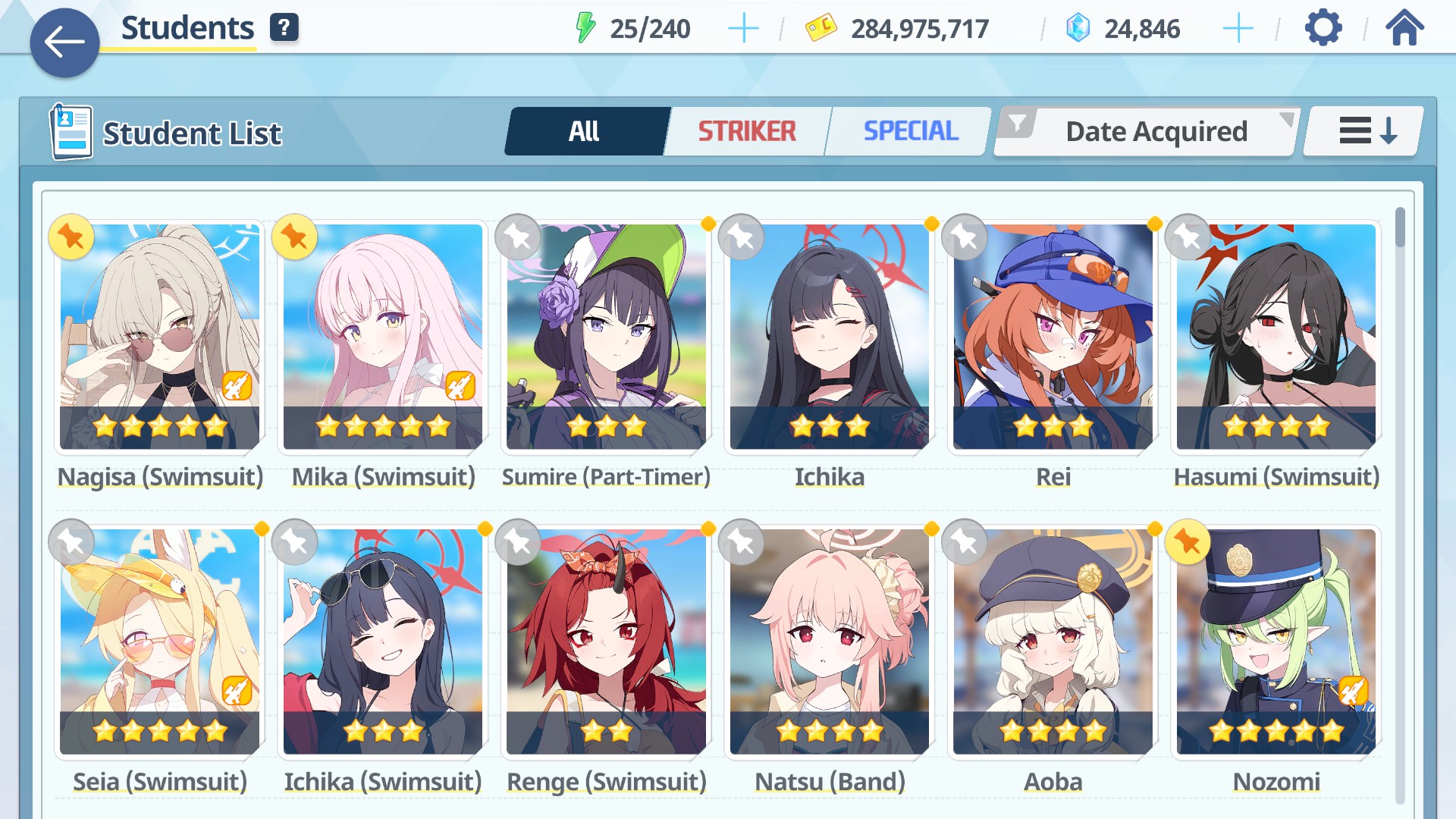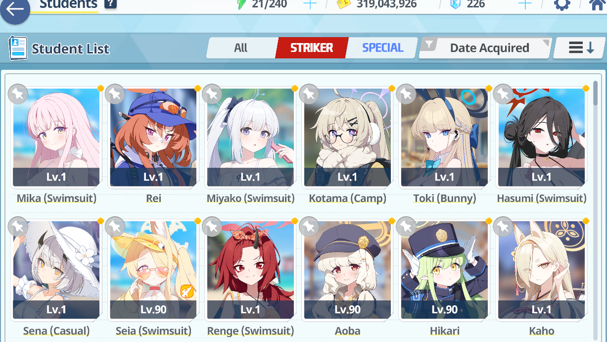 >prep my girls>got a lot of dupes>sSeia, sMika, sNagi>90, 5MMM, 10/10/9, UE30 40 40 for now>Actually got Rio dupes x2 and Kisaki, so time to push them to UE40>might as well max sHasumi since I'm->mats are in the redHeh, it's been a while since I ran out of mats...