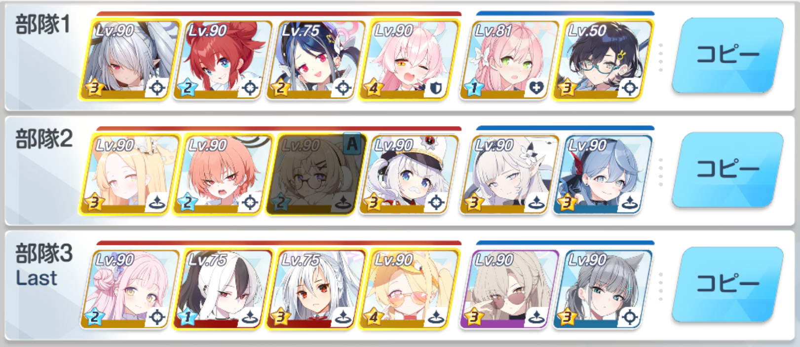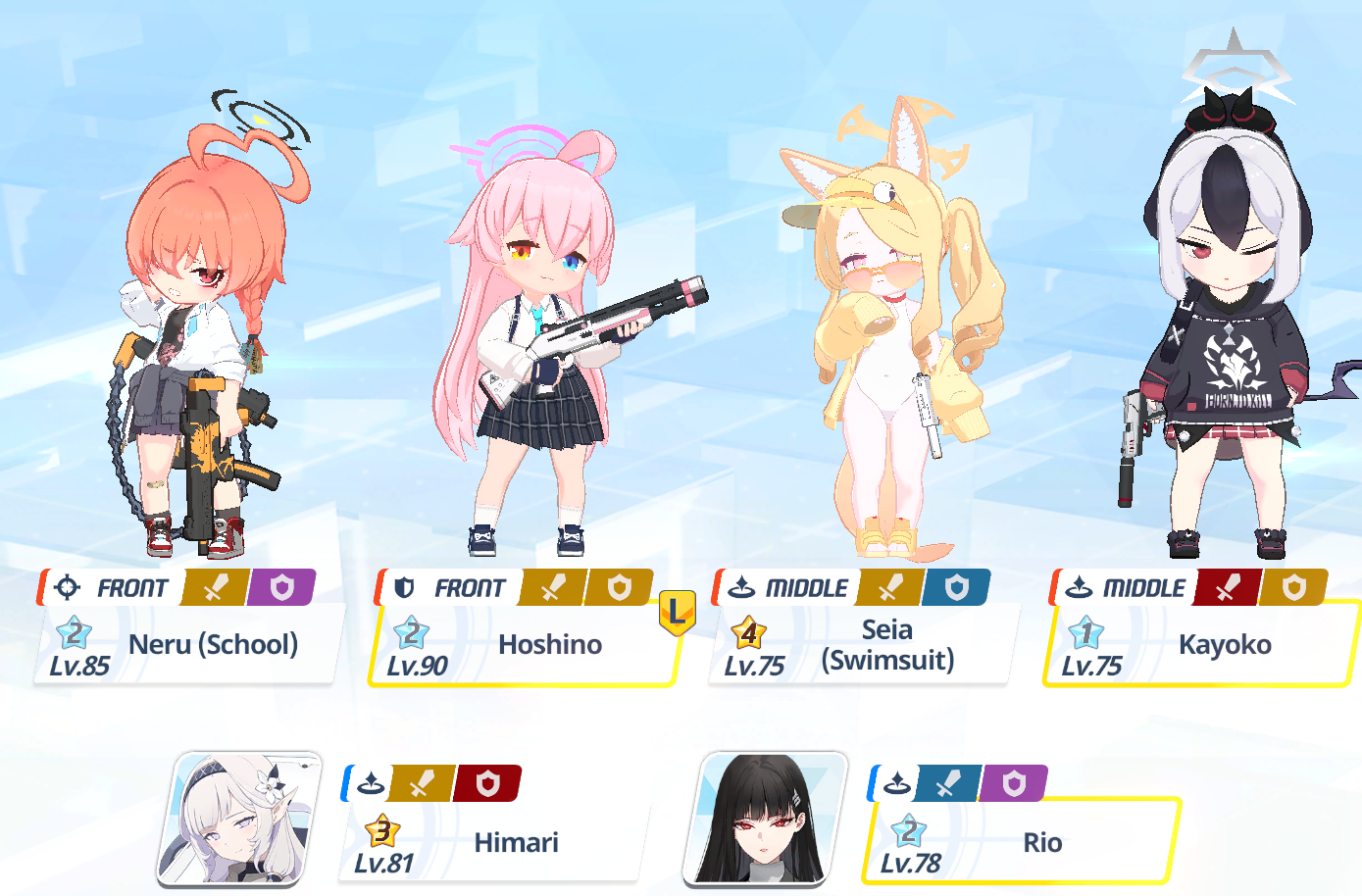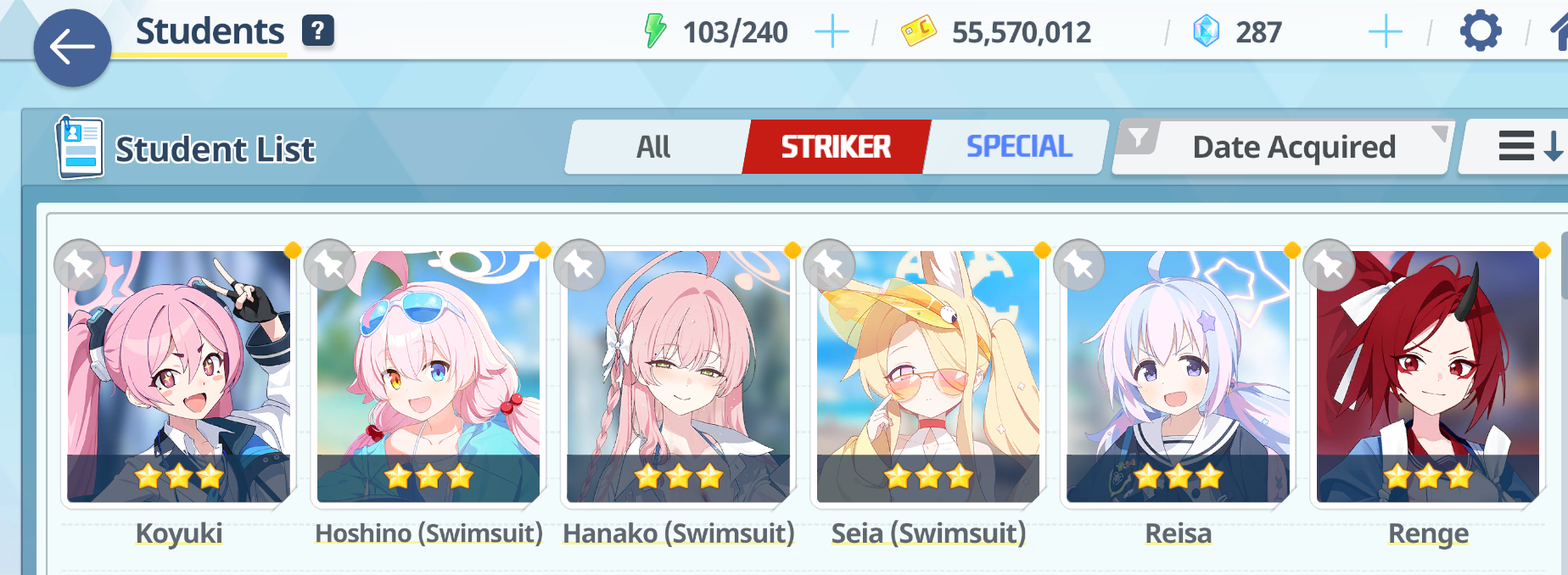 >prep my girls>got a lot of dupes>sSeia, sMika, sNagi>90, 5MMM, 10/10/9, UE30 40 40 for now>Actually got Rio dupes x2 and Kisaki, so time to push them to UE40>might as well max sHasumi since I'm->mats are in the redHeh, it's been a while since I ran out of mats...