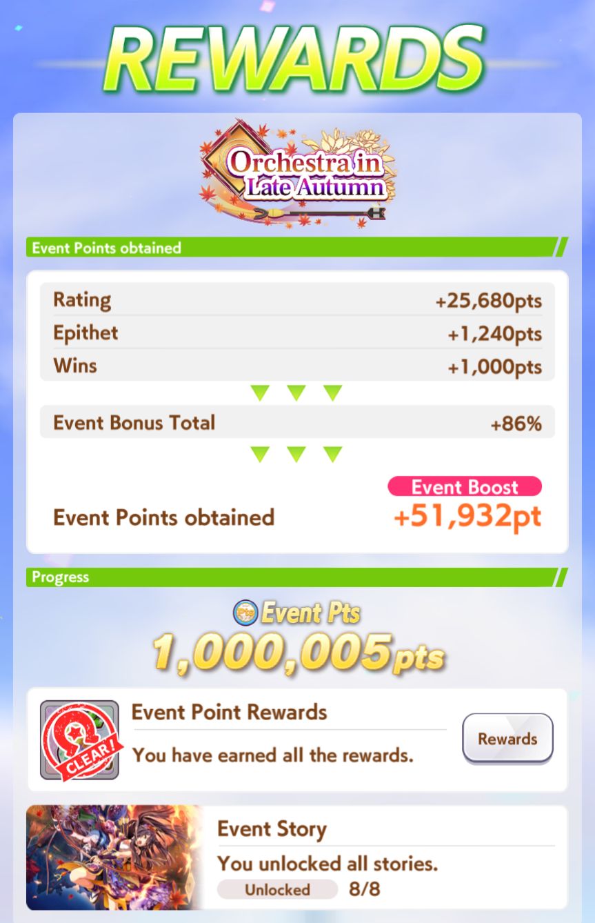 Previous: >>551150835>Global Game NewsLink your account to Cygames iDCurrent Scenario: Aoharu Hai aka "Unity Cup"Current Event: Orchestra in Late AutumnCurrent Rate Up Trainee: Symboli Rudolf 3* (Alt), Gold City 3* (Alt), Tosen Jordan 3*Current Rate Up Support Cards: Curren Chan (SSR), Narita Brian (SSR), Kitasan Black (SSR), El Condor Pasa (SSR)12/24 - Fuji Event12/28 - Scorpio Cup - Tokyo Turf 2000mhttps://umamusume.com/news/100040/https://pages.snep.pw/uma/anni-skill-changes/>JP Game NewsCurrent Rate Up: Oguri Cap 3* (Forma de Cinderella), Stay Gold 3*, Inari One (SSR), Mejiro Dober (SR)New Scenario "Yukoma Hot Spring" releasedTimeline: https://uma.moe/timelineCygames Webstore: https://webstore.cygames.com/en/umamusume_en/>IP NewsUmamusume Cinderella Gray 2nd season started weekly airings on 10/5>Thread Clubshttps://rentry.co/umaglobalclublistYou must be E3 (20k points) to join a circle. Apply with /uma/ or /vg/ in your profile or post ID in the thread.>All Guides & Resourceshttps://rentry.org/uma26Game databasehttps://gametora.com/umamusume (Click the gear to switch between JP / global server info)A basic guide for newfagshttps://rentry.org/umaglobalFind networks if your region is blocked from the game or clienthttps://www.umavpn.top/93Seiyuu & Concertshttps://rentry.org/umstUma Texthttps://umareader.idsmile.xyz/
