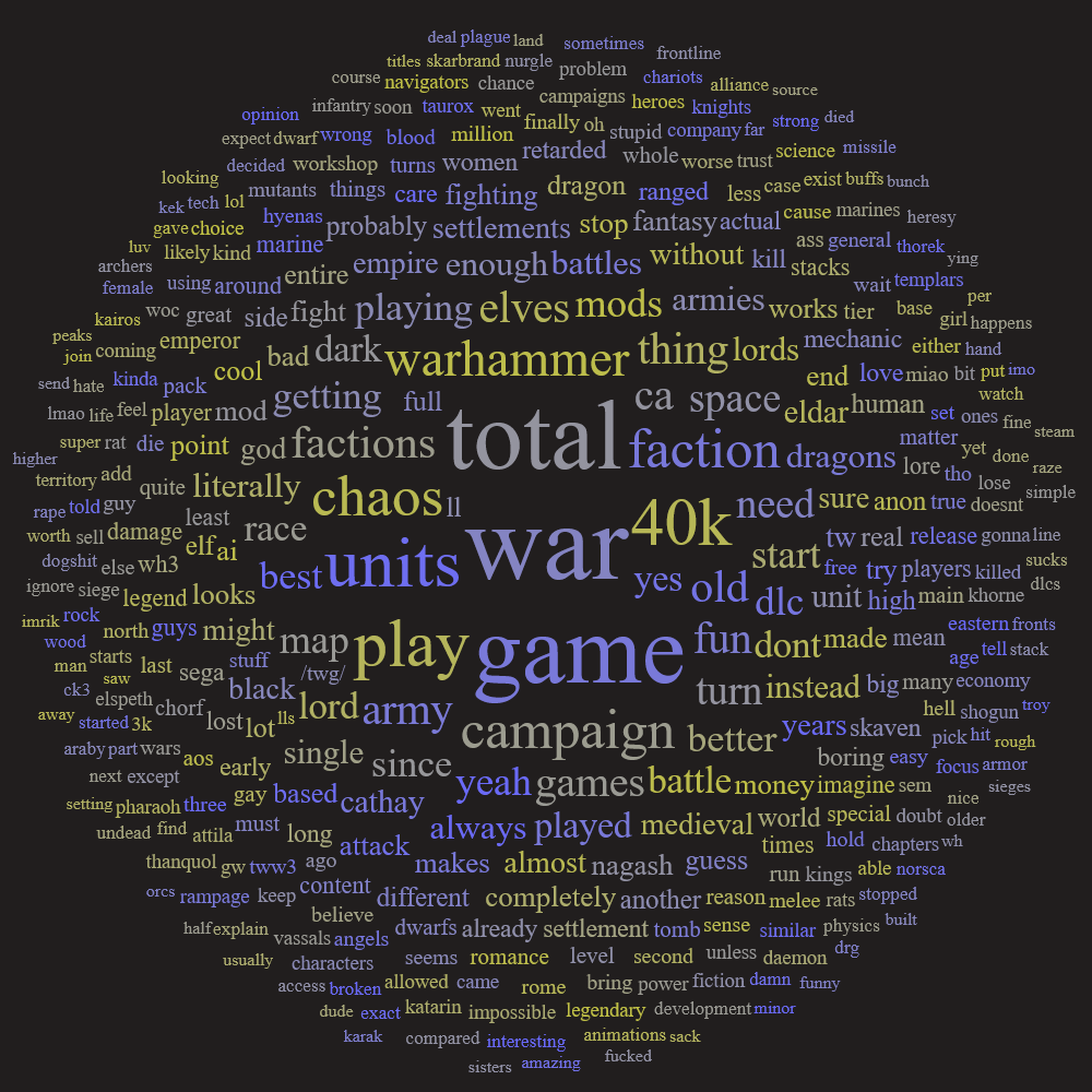 Also - more attention to custom battles, neglected part of total war games. Make them actual sandbox - have a mode where you can deploy and and all units of any faction on your side (or enemies), multiple side battles, toy soldiers style mode (hotseat for custom battles) where you can control all units of all factions to fuck around. More map variety.
