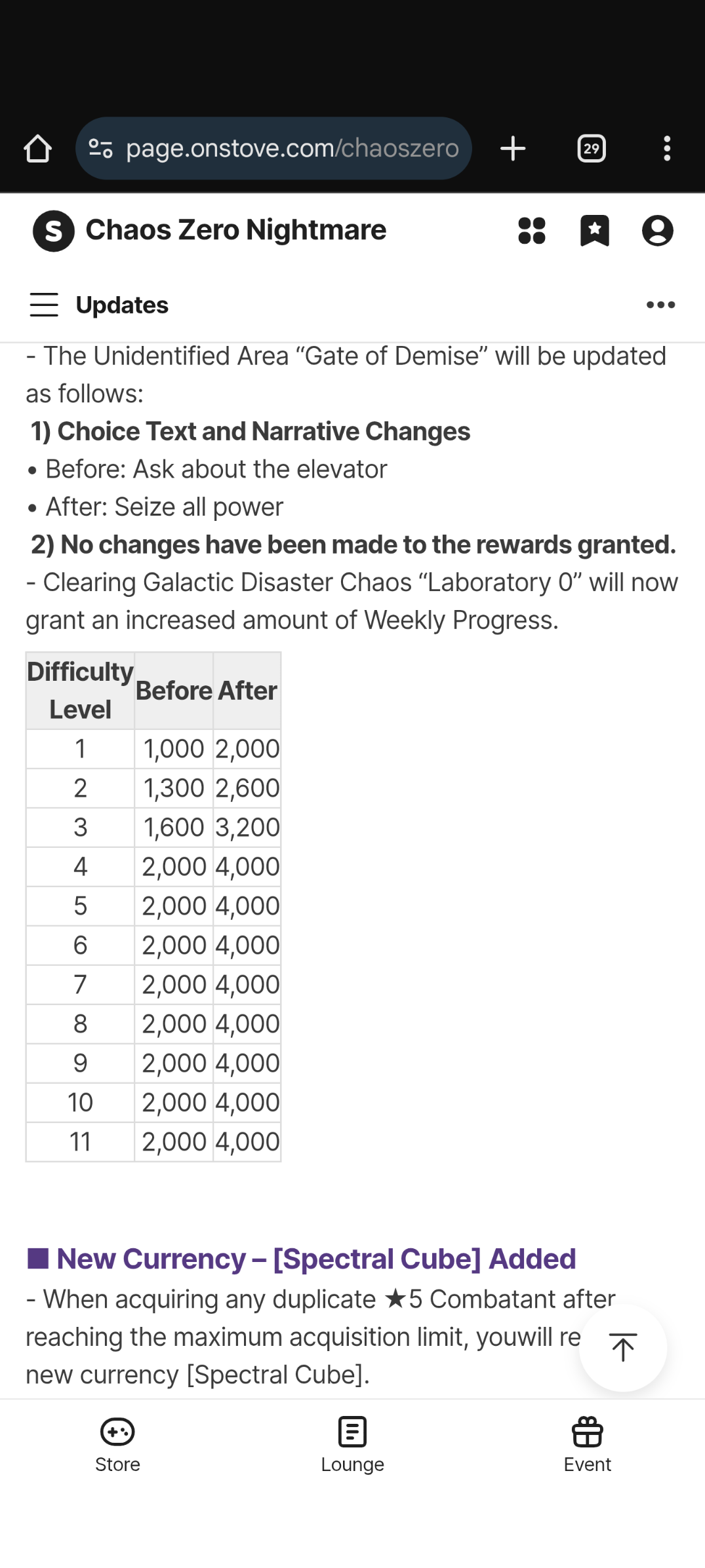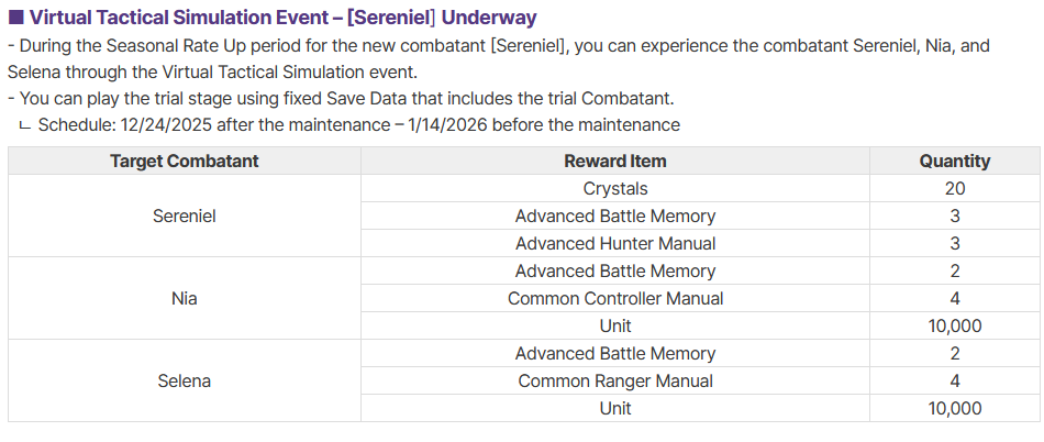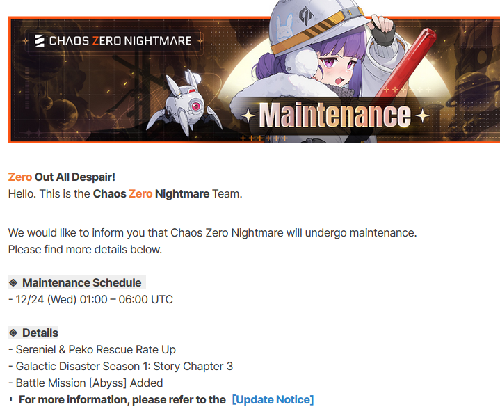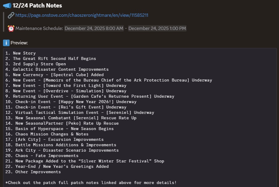 The Nightmare is Ongoing... >>551146607>Roadmap Streamhttps://www.youtube.com/watch?v=FsCuVfILlh4>Dev notes 12/20https://page.onstove.com/chaoszeronightmare/en/view/11551068>Useful Links and Resourceshttps://rentry.org/xtb66f3ihttps://wiki.e7bot.top/#/czn/combatant>Current/Upcoming Featured BannerChizuru - Psionic - Void | Ends Dec24Sereniel - Instinct - Hunter | Starts Dec24 >>>[***LIMITED***]<<<Narja | Starts Jan14Nine | Starts Feb4Tiphera | Statrs Feb25>Current/Upcoming EventsGalactic Disaster - Forbidden Catalysts - Season 1 | Ends Jan13The Great Rift - Season 1 Phase 1 | Ends Dec24Chasing the Star's Trajectory - Login Event | 21-day check-in | Ends Jan13>Why didn't my Save Data save properly?Check the Rentry