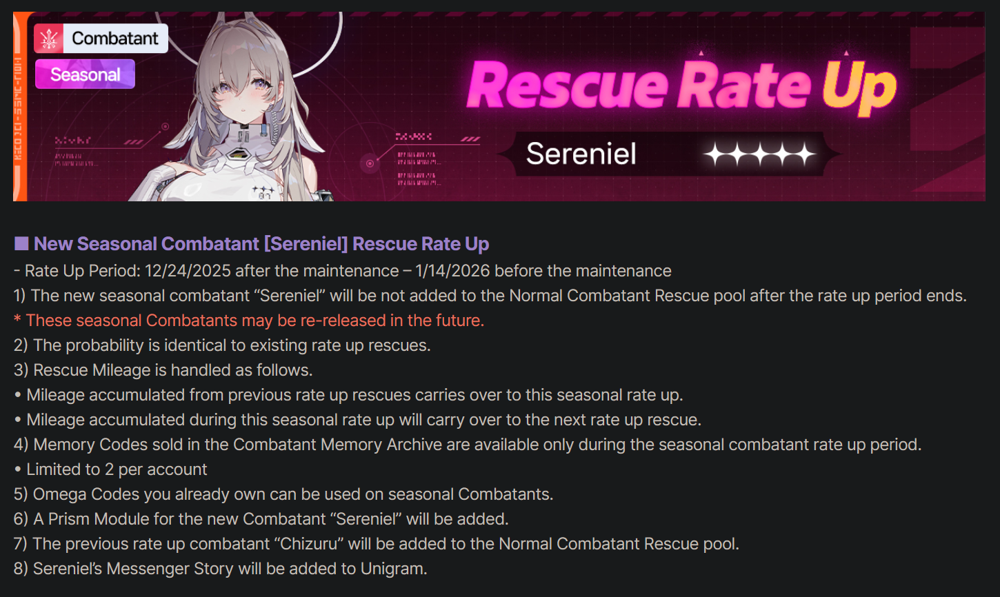 The Nightmare is Ongoing... >>551177039>Roadmap Streamhttps://www.youtube.com/watch?v=FsCuVfILlh4>Dev notes 12/20https://page.onstove.com/chaoszeronightmare/en/view/11551068>Useful Links and Resourceshttps://rentry.org/xtb66f3ihttps://wiki.e7bot.top/#/czn/combatant>Current/Upcoming Featured BannerChizuru - Psionic - Void | Ends Dec24Sereniel - Instinct - Hunter | Starts Dec24 >>>[***LIMITED***]<<<Narja | Starts Jan14Nine | Starts Feb4Tiphera | Statrs Feb25>Current/Upcoming EventsGalactic Disaster - Forbidden Catalysts - Season 1 | Ends Jan13The Great Rift - Season 1 Phase 1 | Ends Dec24Chasing the Star's Trajectory - Login Event | 21-day check-in | Ends Jan13>Why didn't my Save Data save properly?Check the Rentry