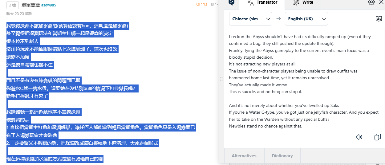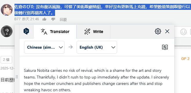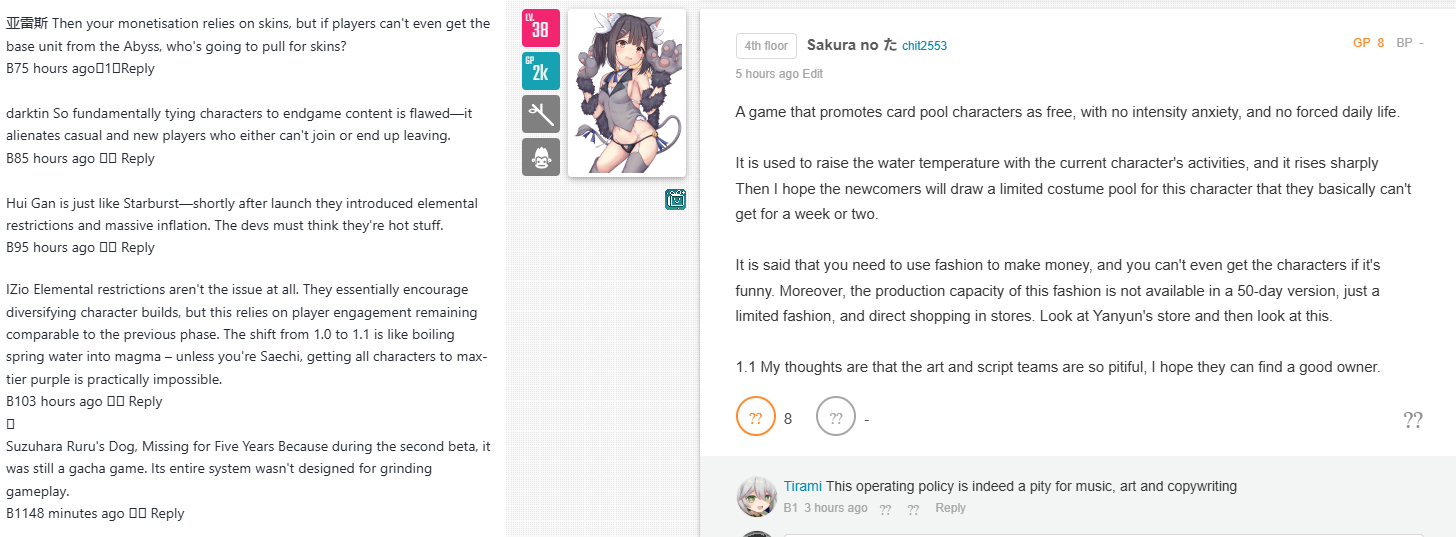 >>551292535Seeing the responses to character acquisition in this game was a bit of a rollercoaster.Back around launch people thought it was nice to be able to get any character for free. Weekly boss timegate was annoying to some but at least it all goes to the shop eventually.Then I see people calling the new thoughts deals greedy because the price is still too high for them. Even defending a gacha game by saying, well actually you can get most/all of the characters there. Which I'm questioning how true that actually is. If say someone took a break for 6 months to a year and character they want doesn't even have a banner up. Much less get multiple copies of certain characters.DNA's system has its flaws but it's funny seeing gachas of all things getting defended in response to this patch. Pretty sure gacha players are either paying even more for characters, skipping certain new characters to save up, and/or playing on a more routine schedule.