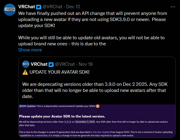 "Virtual Reality, Real Suffering"Sleigh Ride EditionHeadset Selection: https://rentry.org/vrgheadsetsGame Recommendations: https://rentry.org/gxrovVRC Screenshots by World: https://vrg.party/worlds.htmlArchive: https://archive.vrg.party/>Game ResourcesAssets: https://vrg.booru.org/Guides for Avatar and World Dev: https://rentry.org/4tzqsAssetto Corsa: https://rentry.org/hrq69WRC Club: https://rentry.org/vrgwrc23VTOL VR: https://rentry.org/5nuk4Minecraft (Dungeon Crawling): https://crawler.vrg.partyFallout 4: https://rentry.org/pofw5Bonelab: https://rentry.org/bonerlabeu>Regularly Hosted Multiplayer GamesMonday - EU Assetto Corsa: 19:00 UTC / 20:00 CET (every other week)Tuesday - EU Pavlov: 19:00 UTC / 20:00 CETWednesday - NA Assetto Corsa: 8PM ETThursday - NA Walkabout Minigolf: 10PM ETFriday - NA Pavlov: 11PM ET (every other week)Friday - EU VRFPS: 19:00 UTC / 20:00 CET (Game varies, watch the thread)Saturday - SEA/EU Walkabout Minigolf: 13:00 UTC / 23:00 AEST>Regularly Hosted VRChat Eventshttps://rentry.org/mxotqvmh>Current Active VRChat Instanceshttps://anchor.vrg.social/New threads: >>>/vg/vrgOld thread: >>550995898>Upcoming EventsFeels Bar - December 27CosCon Cosplay Event - JanuaryFurniture Event - January