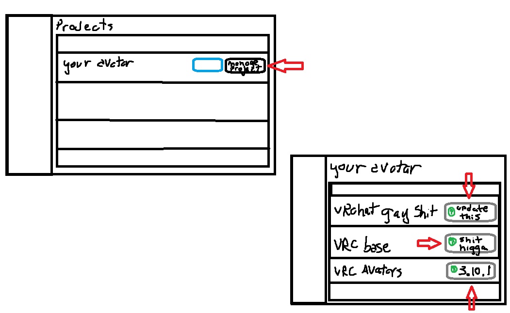 >>551282360VCC! Just go to your Creator Companion, hit "Manage Project", and there's going to be a big green button with the newest version written on it down the "Latest Version" column.