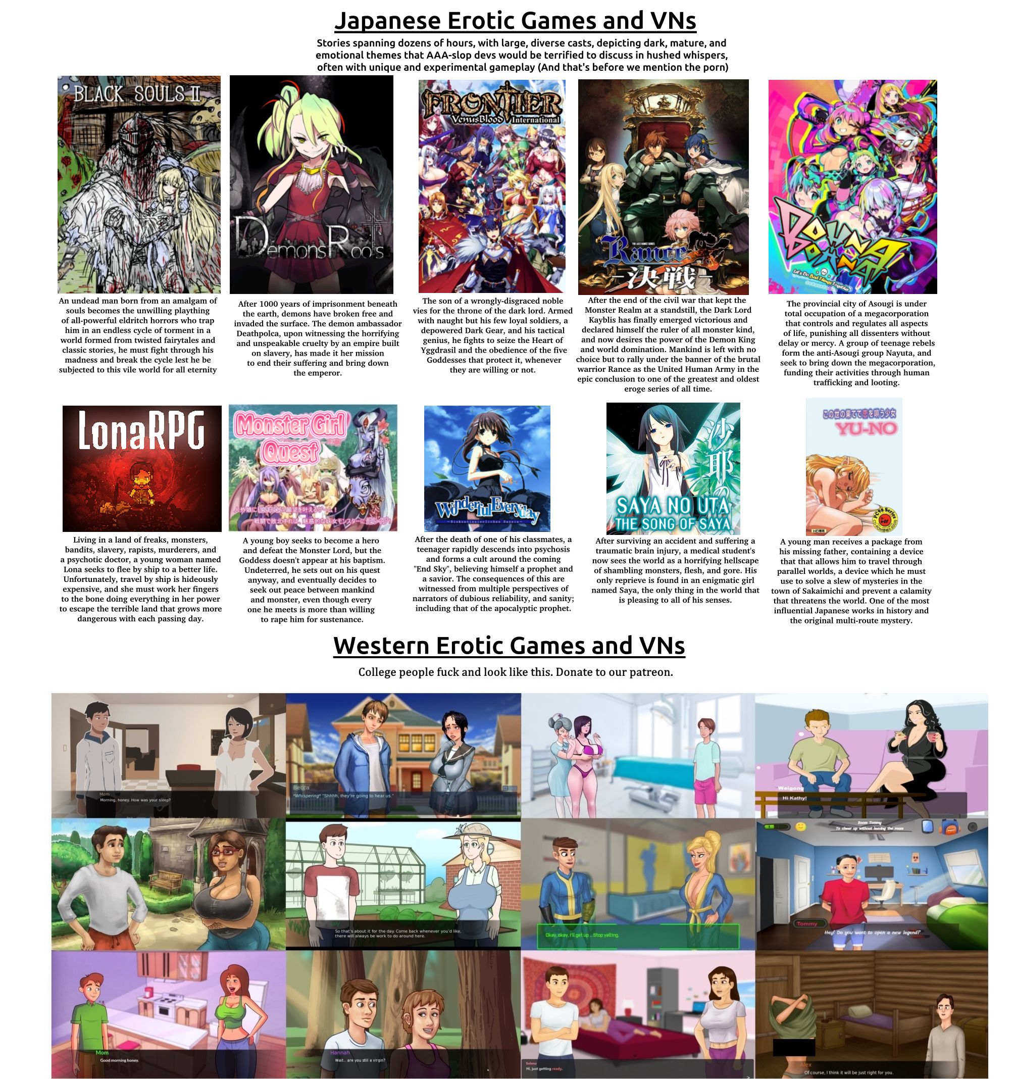 off model to who? editionPrevious Thread: >>5510617072D Hentai games (Hentai RPG, Violated Heroine, H-Action Games) General /hgg2d/ former /vhg/UNLESS EXPLICITLY STATED ASSUME THERE'S NO TRANSLATION AND PLEASE READ THE PASTEBINS BEFORE ASKING QUESTIONS>NEWCOMERS GUIDE: (PLEASE READ BEFORE POSTING)https://bafybeie4sdjrv5hw2ujd5c4dd542eduh2ilhbtnn3puyr2efpnvn4utiqe.ipfs.dweb.link/NEWCOMERS%20GUIDE.txtUPDATE YOUR ARCHIVER BEFORE COMPLAINING ABOUT CORRUPT DOWNLOADS>/hgg2d/ Game Archive - IPFS Editionhttps://ipfs.io/ipfs/QmYwYQxdHdjxX7aVdSyGAiZQpCSZSsVipinxwyb3MeYt3Bhttps://ipfs.io/ipns/k51qzi5uqu5dk8jpgw2ga3qoit4k9ocb328w8mxqlnw36k4m8ebt43ngmoniocRPGMAKER:>IF YOU'RE PLANNING TO PLAY RPGMAKER GAMES, MAKE SURE YOU HAVE THE RIGHT RTP FOR THEMhttps://www.rpgmakerweb.com/run-time-package>HOW TO PLAY THESE GAMES ON LINUXhttps://files.catbox.moe/b1zbm2.txt>RGSS DECRYPTER FOR APPLYING PATCHEShttps://github.com/usagirei/RGSS-Decryptorhttps://files.catbox.moe/s8ju7k.zipMACHINE TRANSLATION>Nifty translation tool by Anon:https://github.com/marisukukise/japReaderDLSITE>RJ CODE QUICKLINK SCRIPT FOR GREASE/TAMPERMONKEYhttps://github.com/kani-ge/DLSite-Links-Plus/https://files.catbox.moe/vy940z.js>RJ Gallery SCRIPThttps://kani-ge.github.io/dlsite-previewer/>DLsite Image Preview Loaderhttps://turquoise-rafaelia-35.tiiny.site/https://github.com/kani-ge/DLSite-Preview-LoaderVH FAQ/Linkshttps://files.catbox.moe/3v2iim.txtTHINGS THAT DON'T BELONG HERE>Fetish discussion outside of the context of video games:>>>/h/>Visual novels:>>>/vg/vn/ or >>>/vg/vng>Non-Japanese games:>>>/aco/weg/ or >>>/aco/weg2d/>3D games:>>>/h/hgg/Please wait for page 10 before making a new thread.