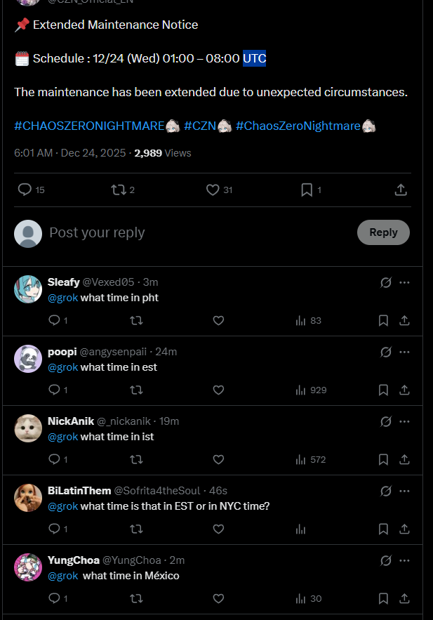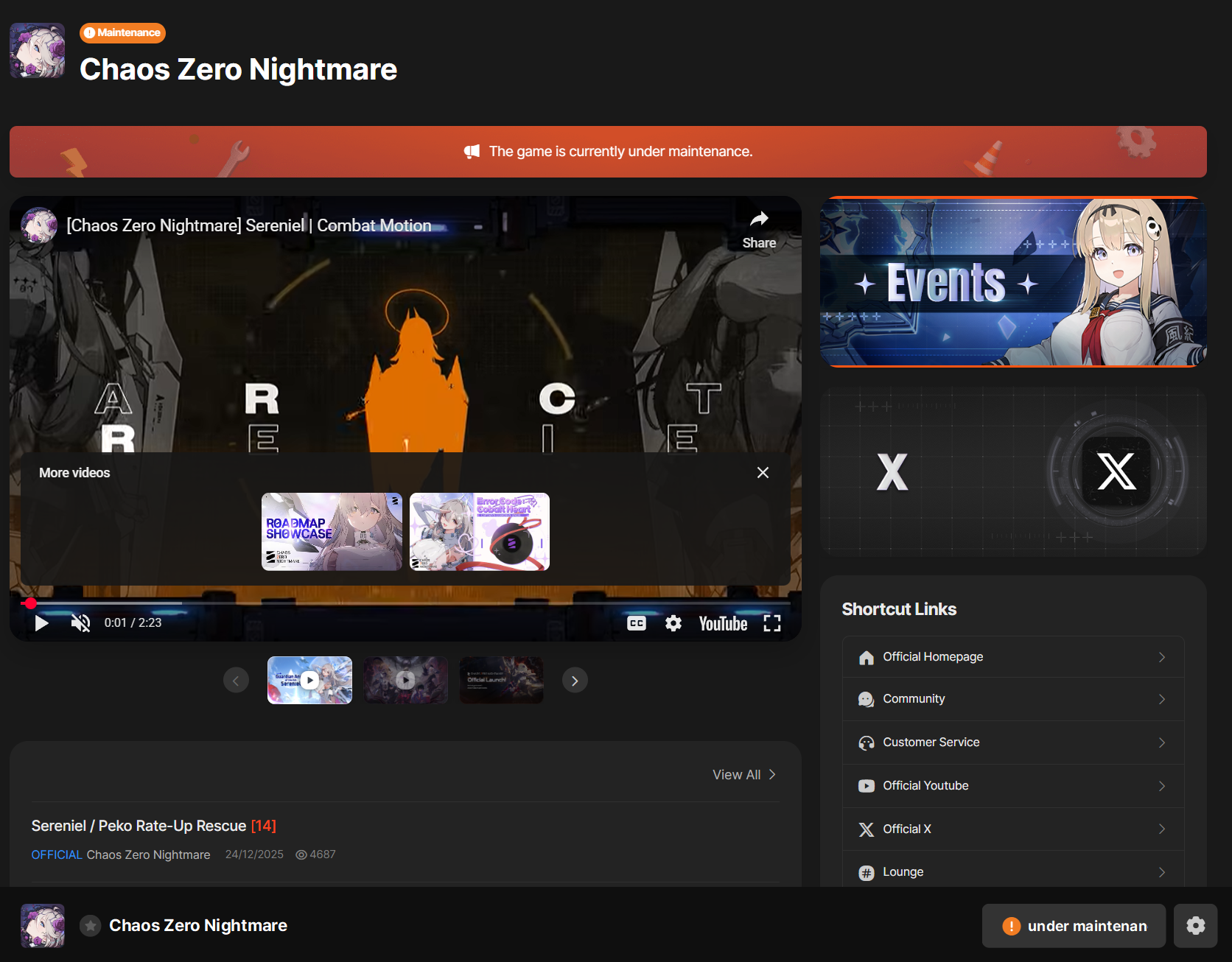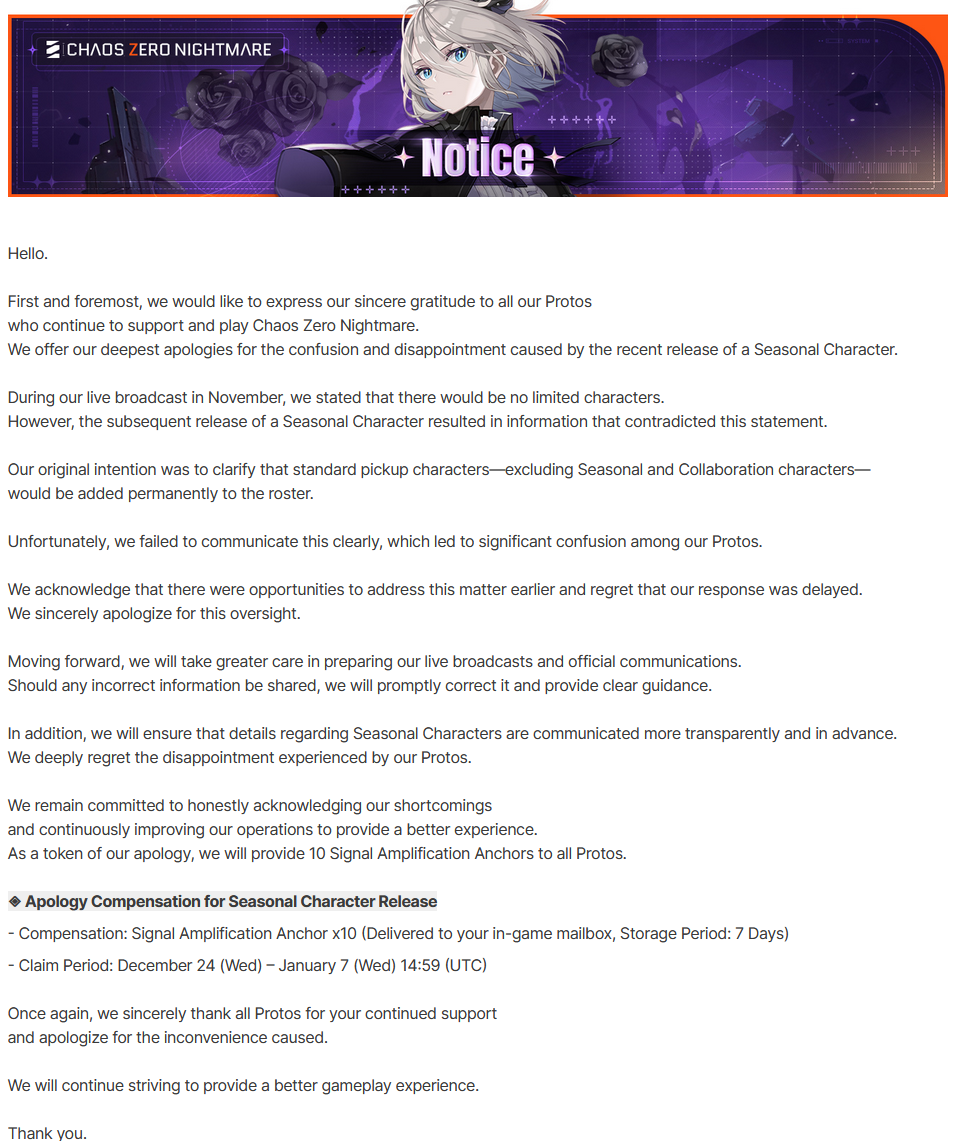The Nightmare is Ongoing... >>551234014>Roadmap Streamhttps://www.youtube.com/watch?v=FsCuVfILlh4>Dev notes 12/20https://page.onstove.com/chaoszeronightmare/en/view/11551068>Useful Links and Resourceshttps://rentry.org/xtb66f3ihttps://wiki.e7bot.top/#/czn/combatant>Current/Upcoming Featured BannerChizuru - Psionic - Void | Ends Dec24Sereniel - Instinct - Hunter | Starts Dec24 >>>[***LIMITED***]<<<Narja | Starts Jan14Nine | Starts Feb4Tiphera | Statrs Feb25>Current/Upcoming EventsGalactic Disaster - Forbidden Catalysts - Season 1 | Ends Jan13The Great Rift - Season 1 Phase 1 | Ends Dec24Chasing the Star's Trajectory - Login Event | 21-day check-in | Ends Jan13>Why didn't my Save Data save properly?Check the Rentry