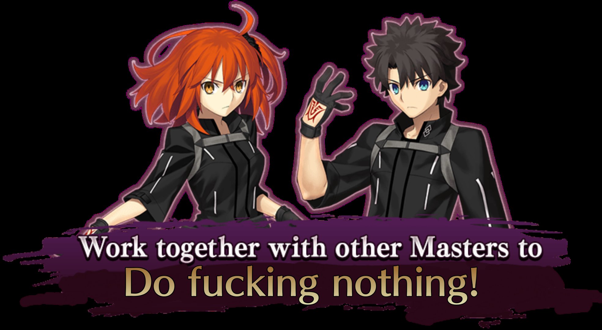 >senpai, I don't want to leave you>don't worry Mash, we'll see each other again, I promise>are you sure?>yeah, that's why I can't wait to do this all over again with you>FGO2 announcement