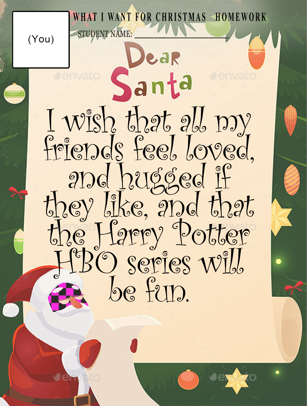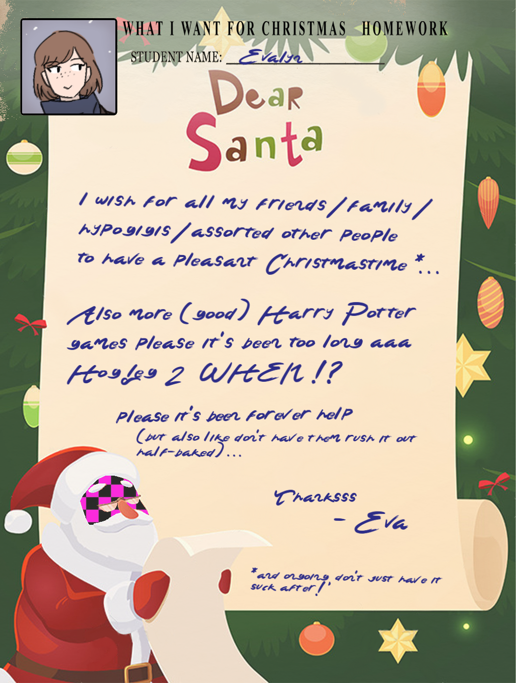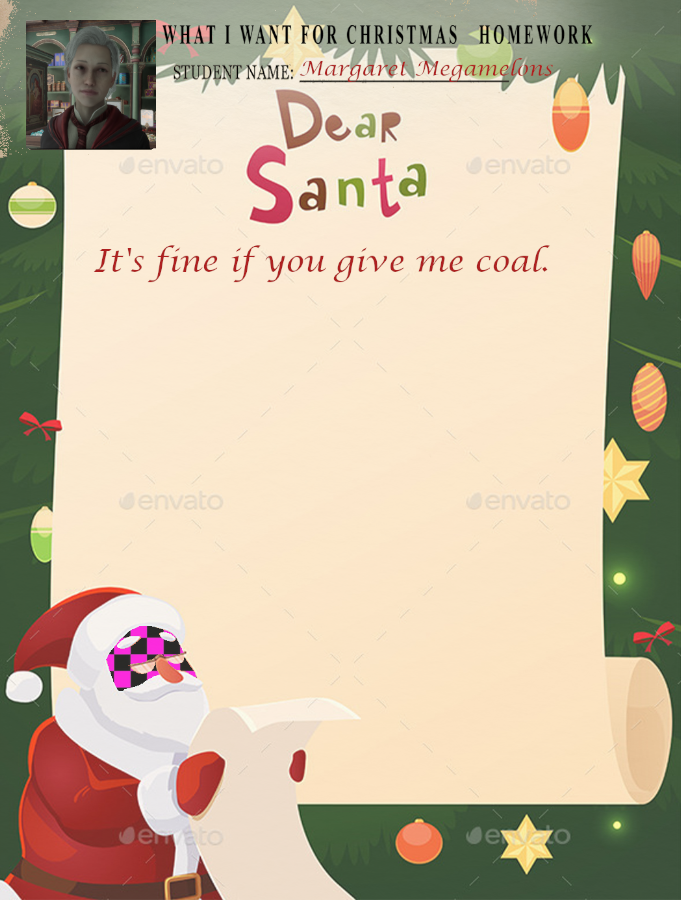 >>551334386Dear Santa, my pain is constant and sharp, and I do not hope for a better world for anyone. In fact, I want my pain to be inflicted on others. I want no one to escape. But even after admitting this, there is no catharsis; my punishment continues to elude me, and I gain no deeper knowledge of myself.