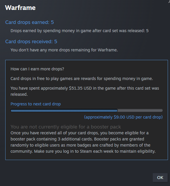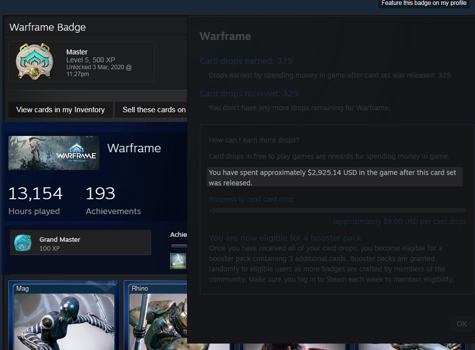 Almost 3k in roughly 6 years, that's with a year off. I didn't think I had spent quite that much, but I do love buying skins. I've only ever bought plat a couple of times, when I was given a 75% discount. All other sources of plat came from trades, got into it very early.13k hours is in-steam game hours, is not representative of my actual play time, which is about 6k in missions.If you're wondering where to find this info, a fellow anon posted this yesterday.>"For the uninitiated, you can find out how much you've paypigged on a game through steam by going to the game's badge page and clicking how do I earn more cards drops? It'll tell you how much you've spent on the game since the badge was introduced.